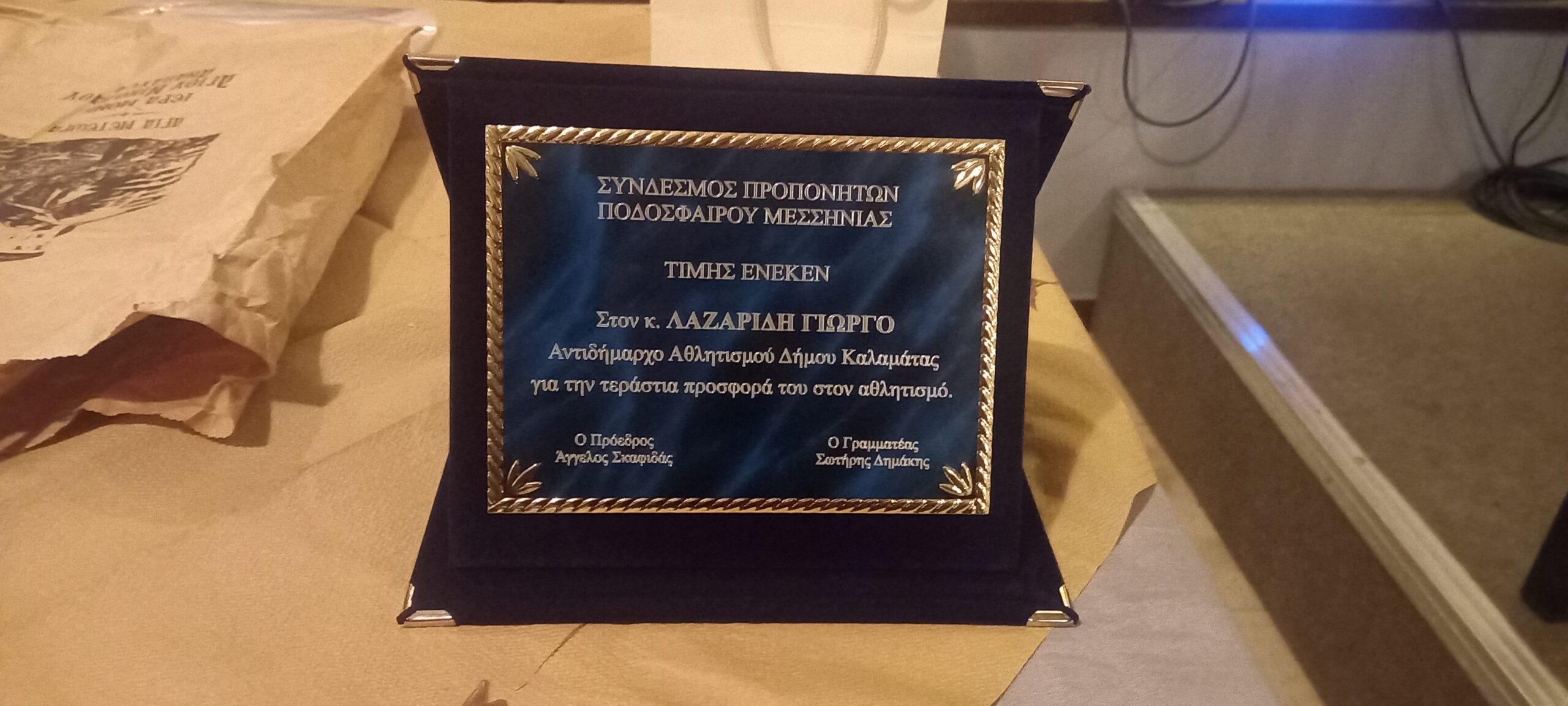 Ο σύνδεσμος τίμησε έναν άνθρωπο του αθλητισμού, που μπορεί σήμερα να αγωνίζεται με την ρακέτα του τένις όμως ξεκίνησε την αθλητική του καριέρα από τα ποδοσφαιρικά γήπεδα, αγωνιζόμενος με την φανέλα του Απόλλωνα Καλαμάτας. Ο λόγος για τον Γιώργο Λαζαρίδη. Ο Μεσσήνιος διεθνής, πρωταθλητής με πολλές διακρίσεις στο τένις με αμαξίδιο στην Ελλάδα και στο εξωτερικό, ο Λαζαρίδης πρόσφατα έλαβε το χρίσμα του αντιδημάρχου αθλητισμού, αναλαμβάνοντας με αίσθημα ευθύνης το νευραλγικό αυτό πόστο στο δήμο Καλαμάτας. Ο σύνδεσμος τίμησε τον Γιώργο Λαζαρίδη για την εν γένει προσφορά του στο αθλητισμό με θερμές ευχές για τις νέες του αρμοδιότητες.