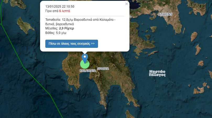 Share Σεισμός 3 βαθμών της κλίμακας ρίχτερ σημειώθηκε νωρίτερα με το επίκεντρό του να εντοπίζεται 12,8 χιλιόμετρα Βορειοδυτικά της Καλαμάτας. Ακολουθήστε το Best-TV στο Google News. 13 Ιανουαρίου 2025 10:16 μμ ΕΤΙΚΕΤΕΣ ΕΛΛΑΔΑ ΚΑΛΑΜΑΤΑ ΣΕΙΣΜΟΣ ΣΧΕΤΙΚΑ ΑΡΘΡΑ Τριήμερη ψυχρή εισβολή, πέφτει έως 10 βαθμούς η θερμοκρασία -Πού «θα φτάσει μισό μέτρο το χιόνι» – Στο «πόδι» ο κρατικός μηχανισμός 11.01.2025 Νέα επιδείνωση του καιρού από την Τρίτη – Η πρόγνωση Αρναούτογλου για χιονοεκπλήξεις 06.01.2025 Ατμοσφαιρική ρύπανση: Ποια ευρωπαϊκή χώρα έχει τον πιο θανατηφόρο αέρα στην Ευρώπη 05.01.2025 Array