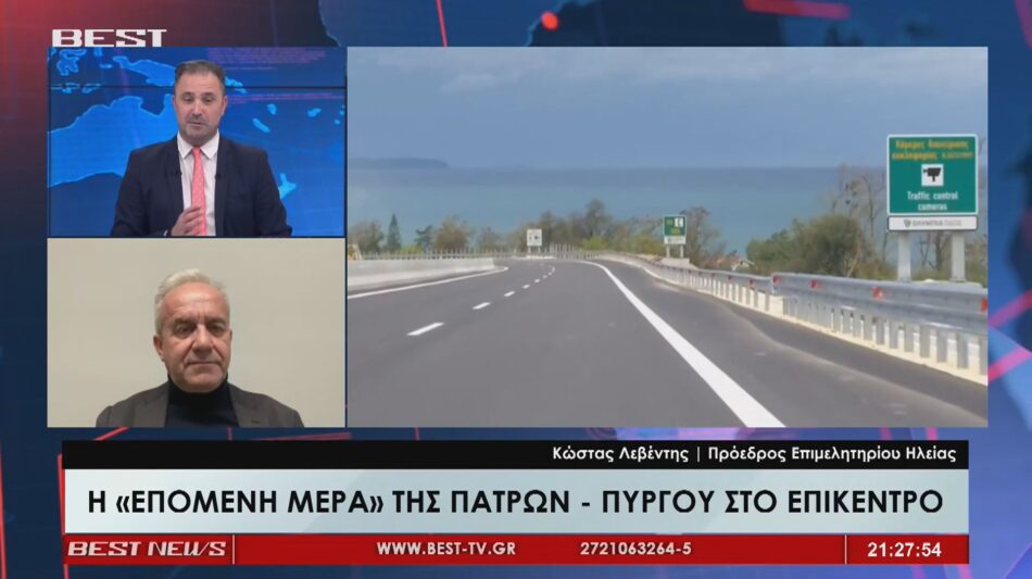 Καθοριστικής σημασίας για την αναπτυξιακή πορεία της Ηλείας χαρακτήρισε τον αυτοκινητόδρομο Πατρών–Πύργου και Πύργος -Καλό Νερό -Τσακώνα ο Πρόεδρος του Επιμελητηρίου Ηλείας, Κωνσταντίνος Λεβέντης, επισημαίνοντας ότι πρόκειται για ένα έργο-καταλύτη για την τοπική οικονομία, μιλώντας στο κεντρικό δελτίο ειδήσεων του BEST, τόνισε, πως η πλήρης αναπτυξιακή του δυναμική μπορεί να αποδώσει μόνο μέσα από έναν ολοκληρωμένο σχεδιασμό, τη δρομολόγηση συμπληρωματικών παρεμβάσεων και την επιτάχυνση των διαδικασιών, ώστε οι υποδομές να λειτουργήσουν ουσιαστικά ως μοχλός ανάπτυξης, εξωστρέφειας και ευημερίας για την περιοχή.