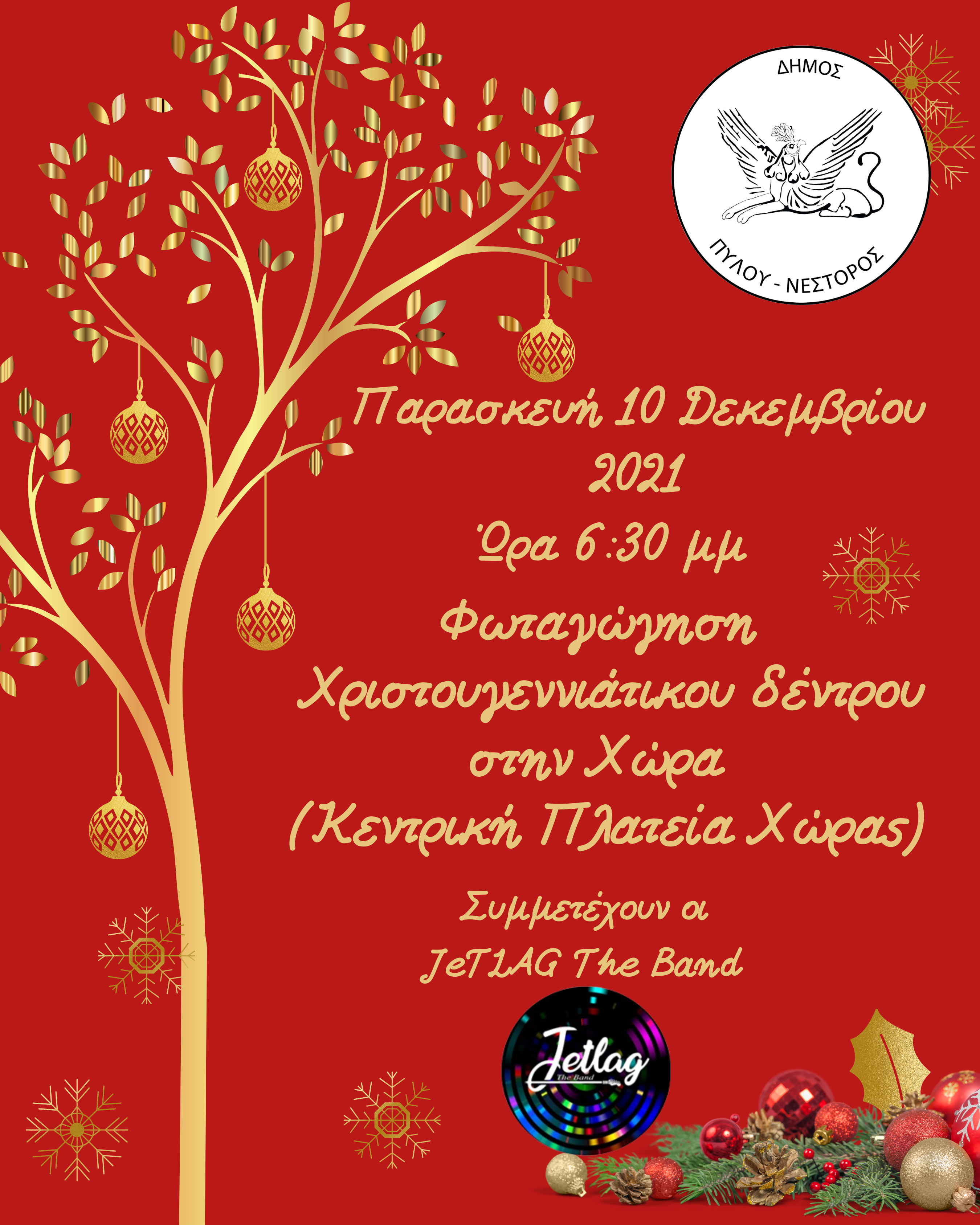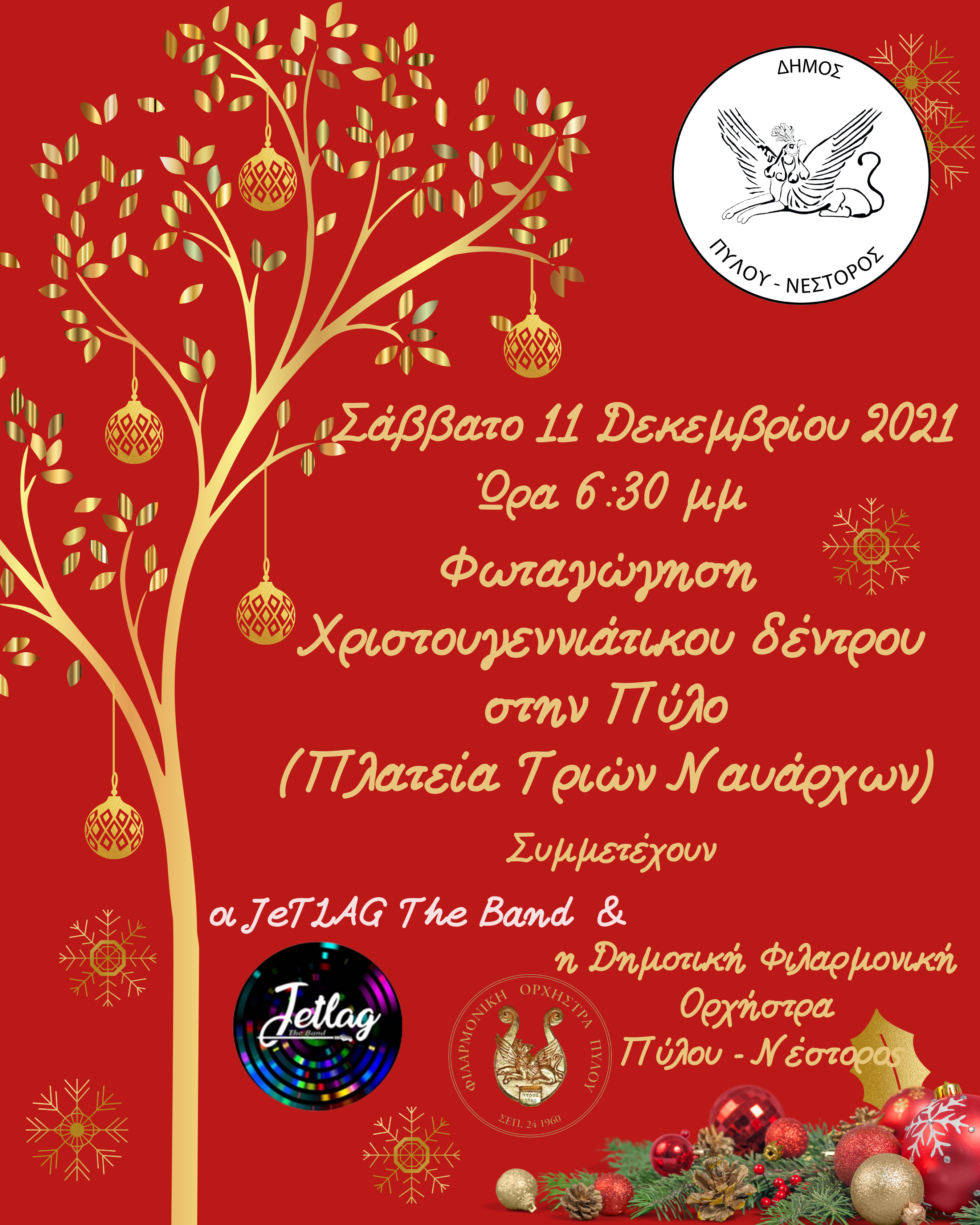Αύριο, Σάββατο 11η Δεκεμβρίου πραγματοποιείται η Φωταγώγηση του Χριστουγεννιάτικου δέντρου στην Πλατεία Τριών Ναυάρχων στην Πύλο καθώς και του εορταστικού στολισμού της πόλης.