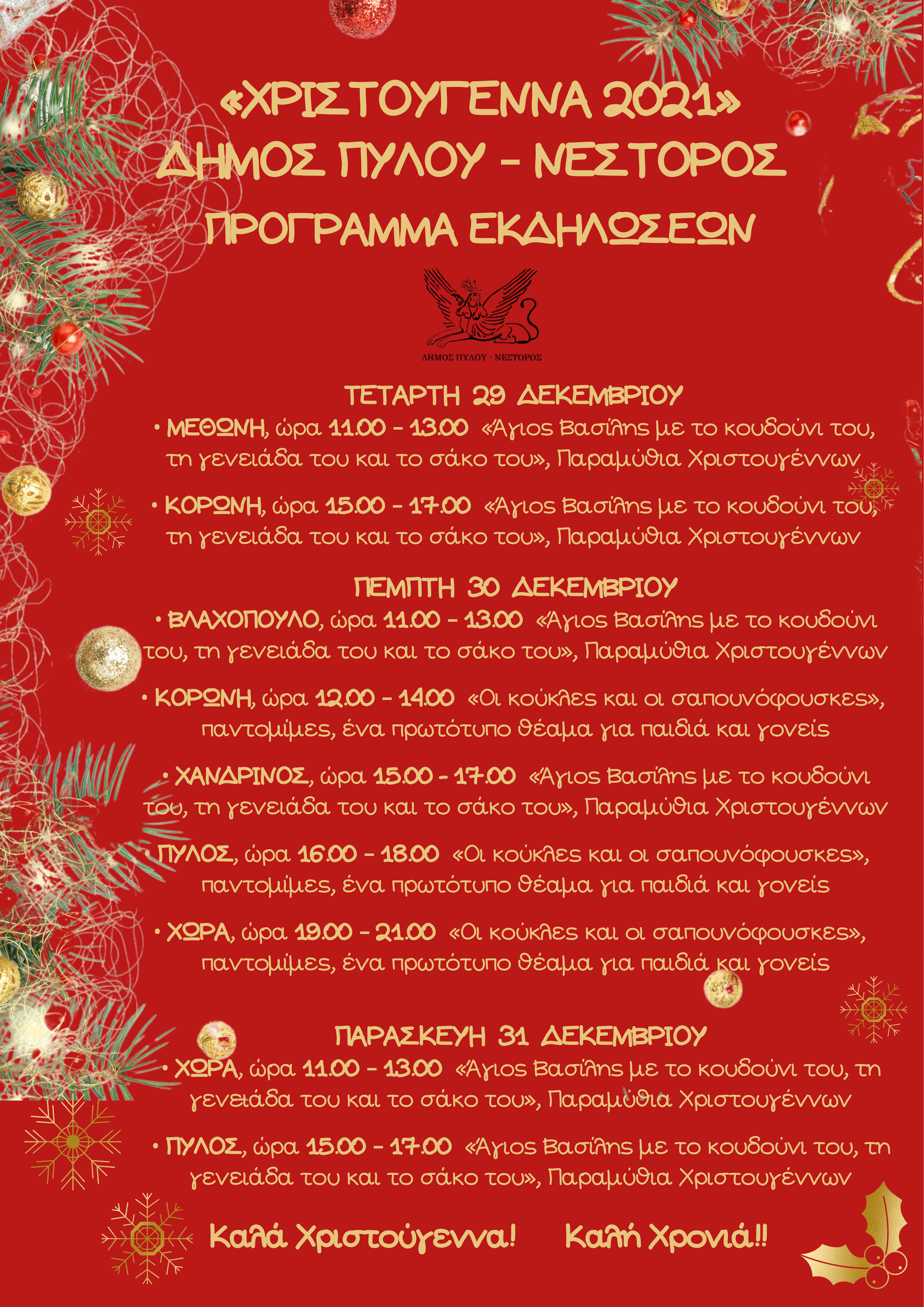 Για πρώτη φορά, θα πραγματοποιηθούν χριστουγεννιάτικες εκδηλώσεις στις έξι Κοινότητες που αποτελούν έδρες των Δημοτικών Ενοτήτων του Δήμου Πύλου – Νέστορος. Από την 29η Δεκεμβρίου έως και την 31η Δεκεμβρίου διαδραστικά σκηνικά σε Μεθώνη, Χώρα, Βλαχόπουλο, Κορώνη, Χανδρινό και Πύλο θα γεμίσουν χαρά τους μικρούς μας φίλους!
