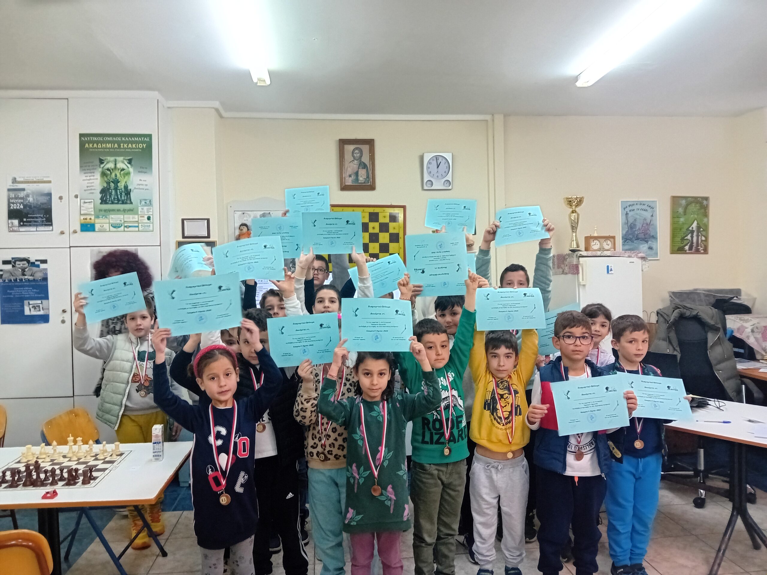 Μετά το πέρας και του 5ου γύρου και παρουσία των οικογενειών των αθλητών, έγινε από την Έφορο και Διευθύντρια Αγώνων η απονομή μεταλλίων και αναμνηστικών διπλωμάτων σε όλα τα παιδιά. Επίσης οι διαιτητές Τσεκούρας Θοδωρής και Αλειφέρη Κατερίνα κέρασαν γλυκά και χυμούς. Η Έφορος συνεχάρη τους αθλητές και τις οικογένειές τους και ευχαρίστησε τον Ενοριακό Ναό της Αναστάσεως του Χριστού και τον Πανοσολογιώτατο π. Αλέξιο για την μεγάλη αγκαλιά αγάπης που έχει ανοίξει προς όλα τα παιδιά. Επίσης ευχαρίστησε τα Super Market Αφοί Μουργή για την προσφορά των χυμών. Ευχήθηκε υγεία και καλή πρόοδο σ’ όλα τα παιδιά και τις οικογένειές τους.