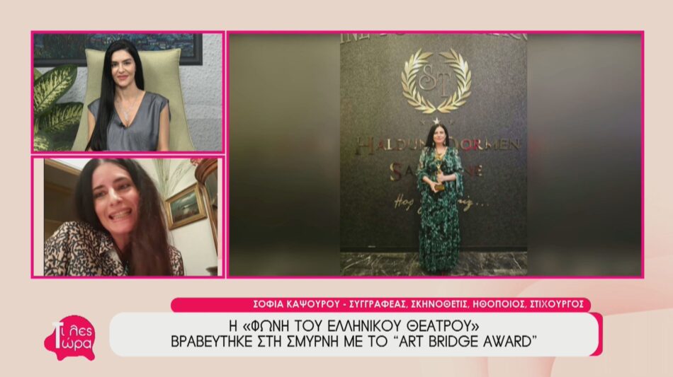 Η διακεκριμένη Ελληνίδα δημιουργός, Συγγραφέας – Σκηνοθέτις – Ηθοποιός και Στιχουργός, Σοφία Καψούρου, η οποία μας γέμισε εθνική περηφάνια με την πρόσφατη βράβευσή της με το ”Art Bridge Award” στη Σμύρνη της Τουρκίας, ήταν καλεσμένη στην εκπομπή «Τι Λες Τώρα» με την Αναστασία Μάντζαρη. Η κυρία Καψούρου μίλησε για τη μεγάλη αυτή διάκριση, η οποία χτίζει μια ουσιαστική γέφυρα τέχνης και πολιτισμού με την Τουρκία.