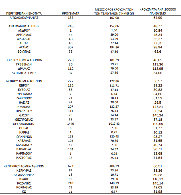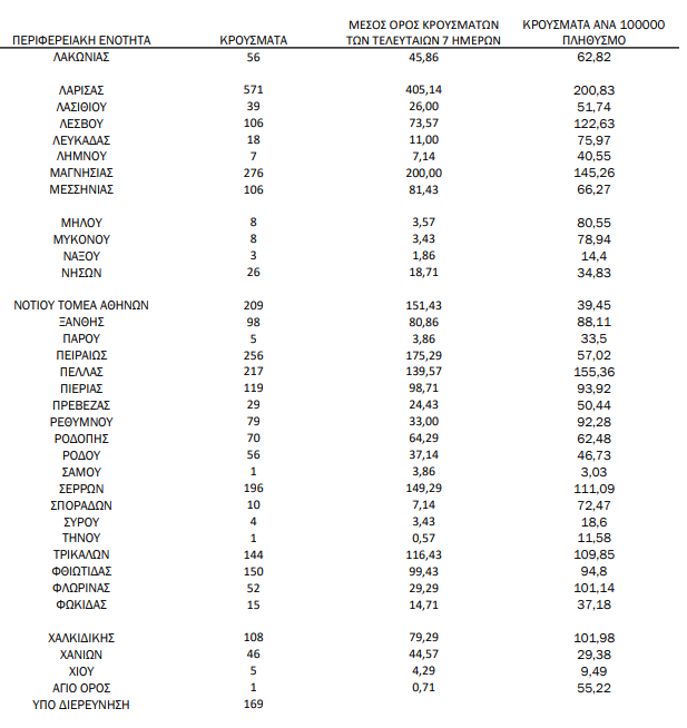 Η Λακωνία σήμερα δίνει 56 νέες μολύνσεις, η Αργολίδα 44, 48 η Αρκαδία, 72 η Κορινθία και 47 η Ηλεία.