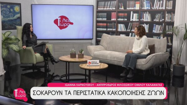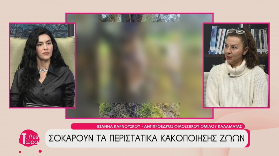 Στην εκπομπή «Τι λες τώρα» με την Αναστασία Μάντζαρη, βρέθηκε καλεσμένη η Αντιπρόεδρος του Φιλοζωικού Ομίλου Καλαμάτας, Ιωάννα Καρνούσκου, σε μια συγκλονιστική συζήτηση για τα πρόσφατα κρούσματα ακραίας βίας κατά των ζώων. Με αφορμή τον απαγχονισμό σκύλου στην Τριφυλία, τη σεξουαλική κακοποίηση κουταβιού στην Καρδίτσα και τον ακρωτηριασμό ζώου στο χωριό Χανδρινού του Δήμου Πύλου – Νέστορος, η κυρία Καρνούσκου ανέλυσε τη βαθιά κοινωνική παθογένεια πίσω από αυτές τις κτηνωδίες. Κατά τη διάρκεια της συνέντευξης, τονίστηκε η ανάγκη για σπάσιμο της σιωπής στις τοπικές κοινωνίες και η αυστηρή εφαρμογή του νόμου που καθιστά πλέον την κακοποίηση κακούργημα.