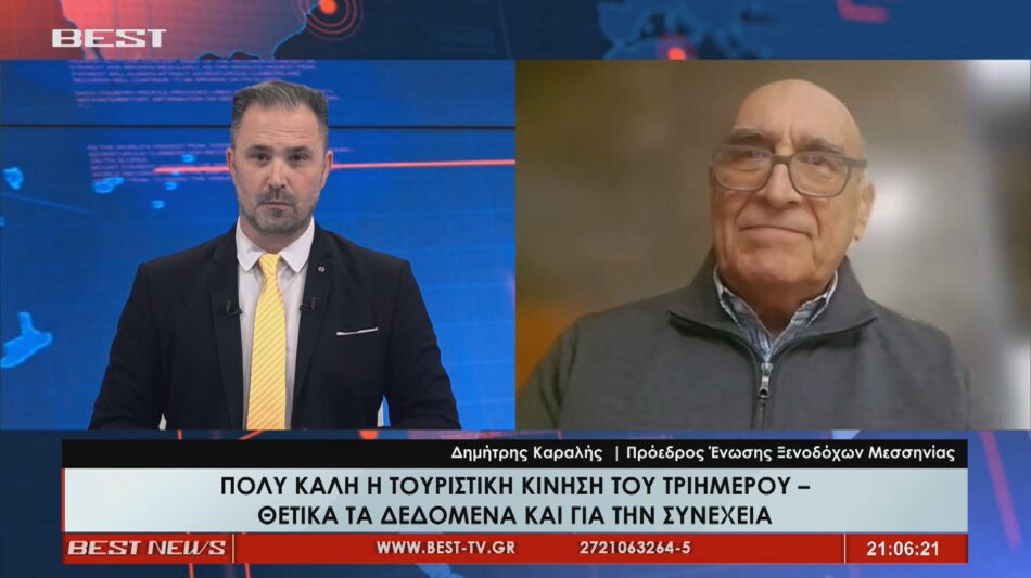 Κάτι παραπάνω από θετικό αποτύπωμα άφησε η τουριστική του τριημέρου της αποκριάς στη Μεσσηνία με την πληρότητα στα ξενοδοχεία να αγγίζει το 100% σε πολλές περιπτώσεις. Χαρακτηριστικά τα όσα ανέφερε μιλώντας στο Κεντρικό Δελτίο Ειδήσεων της τηλεόρασης BEST ο Πρόεδρος Ξενοδόχων Μεσσηνίας Δημήτρης Καραλής σημειώνοντας «Όλα αυτά βέβαια είναι θετικά, είναι στοιχεία τα οποία μας δίνουν το βήμα για να προβάλουμε σθεναρά τα αιτήματά μας και να καταδείξουμε ότι η περιοχή μας και η Πελοπόννησος υπολείπεται από το να δημιουργηθούν οι προϋποθέσεις αυτές που χρειάζεται να είναι τουριστικός προορισμός… Αντιμετωπίζουν τεράστιο πρόβλημα βιωσιμότητας οι επιχειρήσεις, υπολειπόμαστε σε έργα υποδομής. Επίσης το αεροδρόμιο. Μόλις προχθές ήρθαν οι υψηλόβαθμοι της Fraport να μας πουν ότι όλα θα βαίνουν καλά και ότι το 2030 θα έχουμε εν πάση περιπτώσει 500.000 τουρισμό. Αυτά είναι νούμερα τα οποία είναι υποθετικά, εμείς θα πρέπει να δούμε ακριβώς χειροπιαστά ότι μπαίνουμε σε μια σοβαρή οργάνωση και στρατηγική».