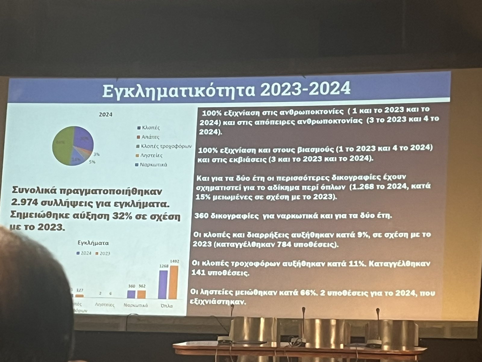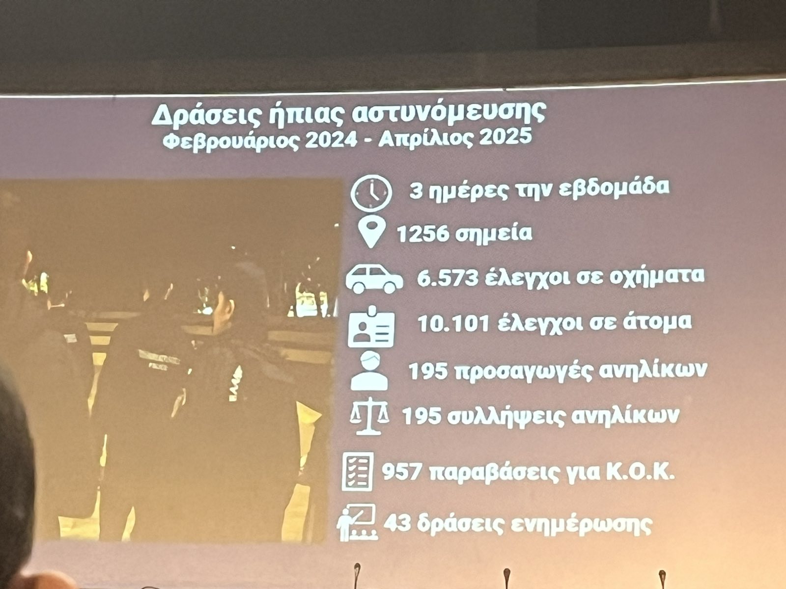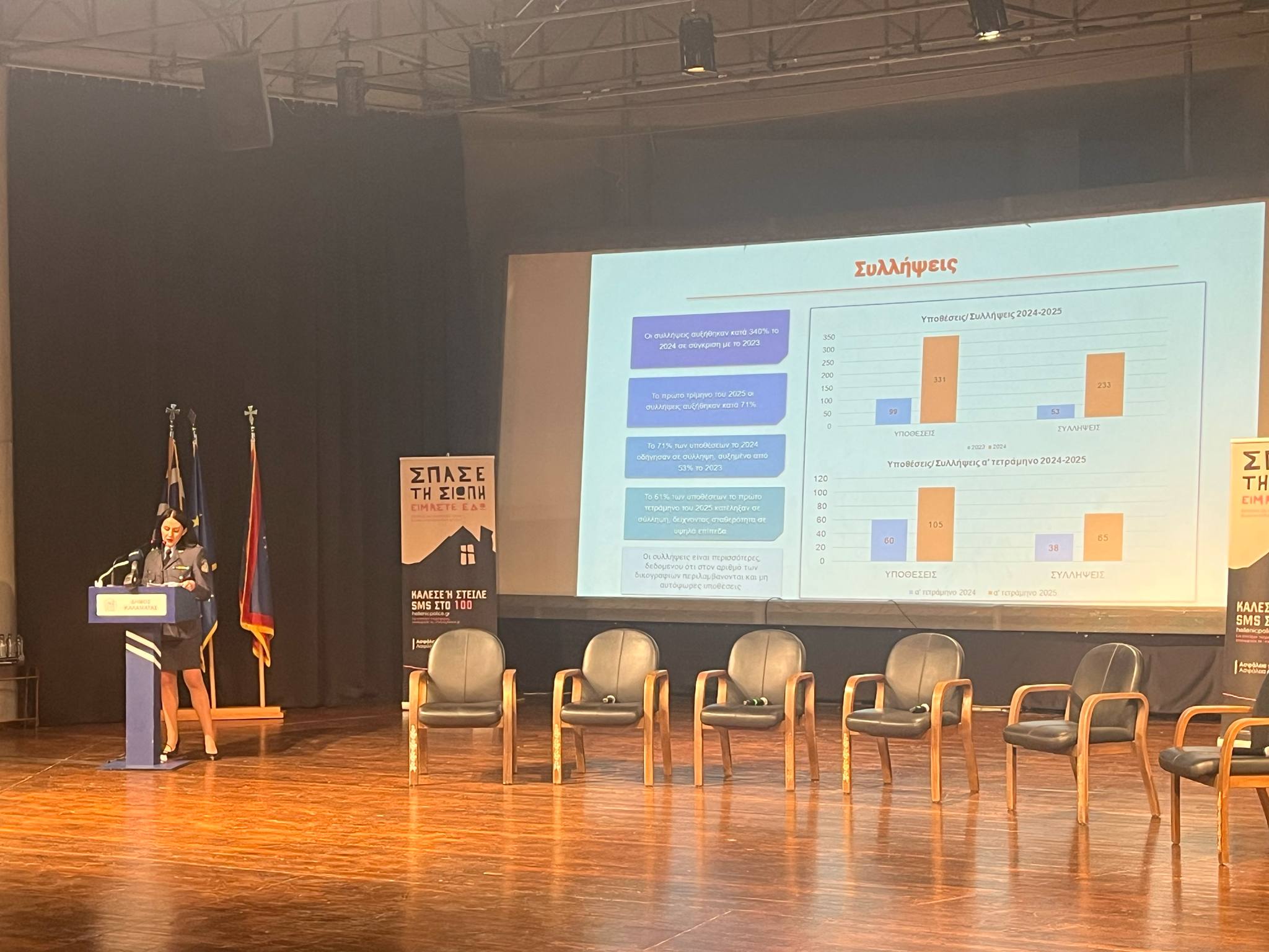 Στο πλαίσιο της εκδήλωσης έγινε και ο απολογισμός του αστυνομικού έργου στη Μεσσηνία, τον οποίο παρουσίασε ο Αστυνομικός Διευθυντής της Διεύθυνσης Αστυνομίας Μεσσηνίας, Αθανάσιος Χριστόπουλος με τα στοιχεία που αφορούν στην παραβατικότητα των ανηλίκων να προκαλούν έντονη ανησυχία, εντείνοντας την αναγκαιότητα αντιμετώπισής της.