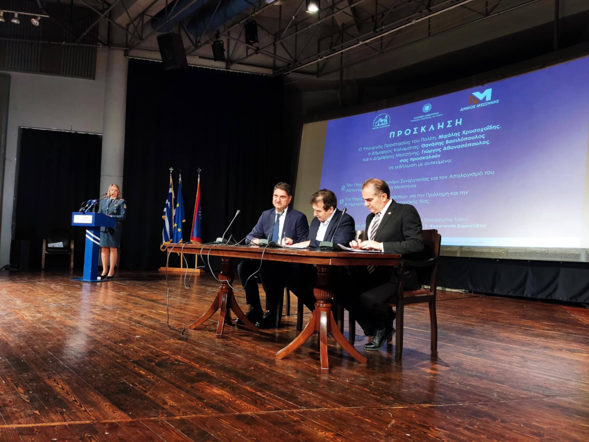 Ο Υπουργός Προστασίας του Πολίτη, Μιχάλης Χρυσοχοΐδης, ο Δήμαρχος Καλαμάτας, Θανάσης Βασιλόπουλος και ο Δήμαρχος Μεσσήνης, Γιώργος Αθανασόπουλος προχώρησαν στην υπογραφή Μνημονίων Συνεργασίας για την ενίσχυση της συνεργασίας Υπουργείου, ΕΛ.ΑΣ και Δήμων για την ανάπτυξη δράσεων με στόχο την αντιμετώπιση της εγκληματικότητας και της βελτίωσης της ζωής των συμπολιτών μας.