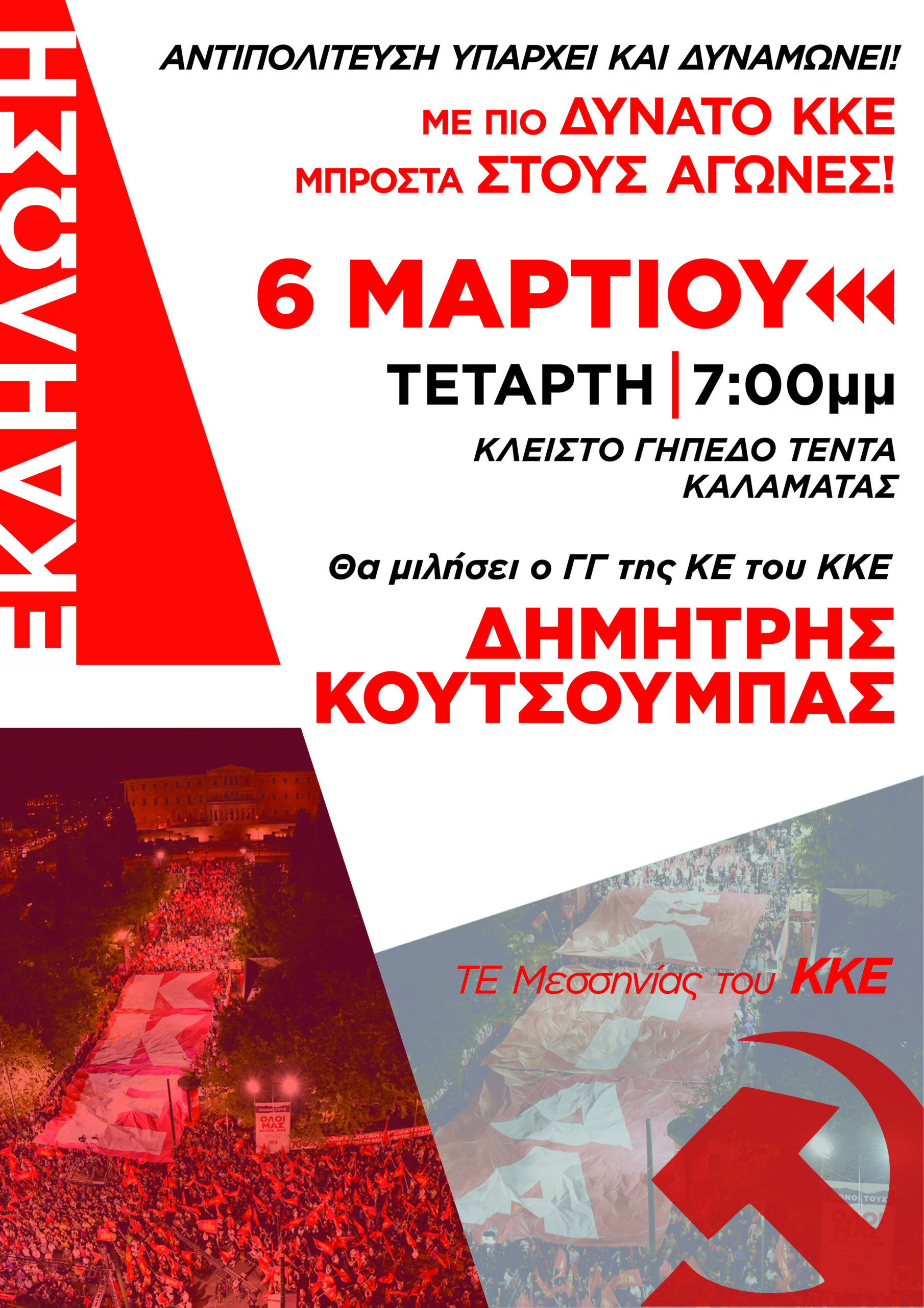 Η ομιλία του Δημήτρη Κουτσούμπα, θα γίνει την Τετάρτη 6 Μαρτίου στις 19.00, στο κλειστό γήπεδο «Τέντα» Καλαμάτας, σε εκδήλωση με θέμα: «Αντιπολίτευση υπάρχει και δυναμώνει! Με πιο δυνατό ΚΚΕ μπροστά στους αγώνες!»