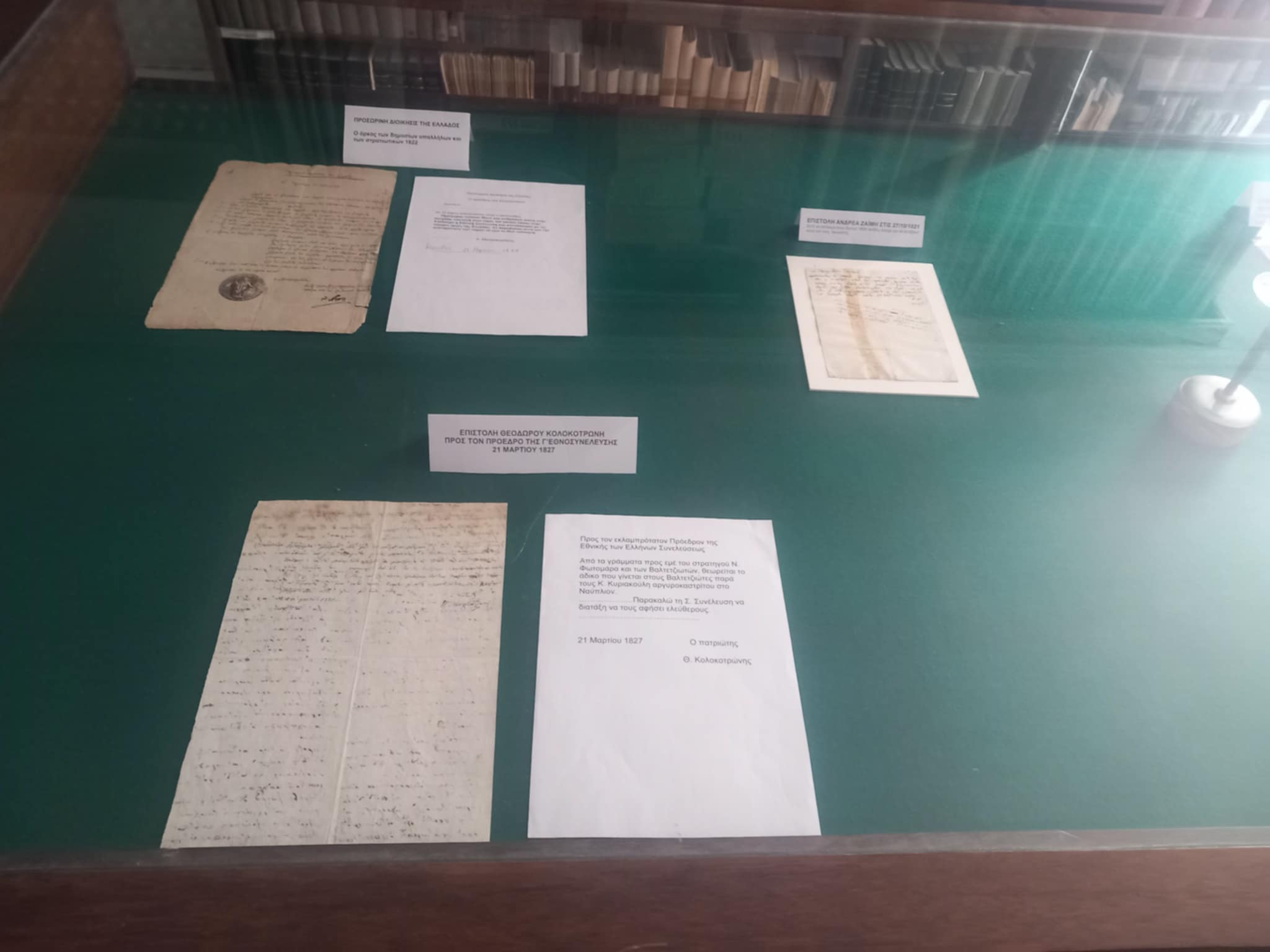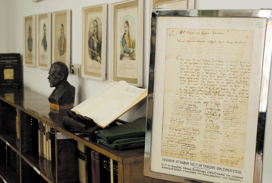 Η έκθεση περιλαμβάνει πρωτότυπα κειμήλια και πηγές που τεκμηριώνουν την Επανάσταση καθώς και τα πρώτα χρόνια της ίδρυσης του ελληνικού κράτους, όπως: επιστολή του Θεόδωρου Κολοκοτρώνη (1827), το αυθεντικό πρακτικό της Γ’ Εθνοσυνέλευσης με το οποίο προσκαλείται ο Ιωάννης Καποδίστριας να αναλάβει την διακυβέρνηση της ελεύθερης Ελλάδας (1827), φύλλο της εφημερίδας «Ελληνικά Χρονικά» που εξέδιδε ο Ιάκωβος Μάγιερ στο Μεσολόγγι (1824), αποφάσεις του Ιωάννη Καποδίστρια, ο Άτλαντας του Αγώνα του 1821 κ.ά.