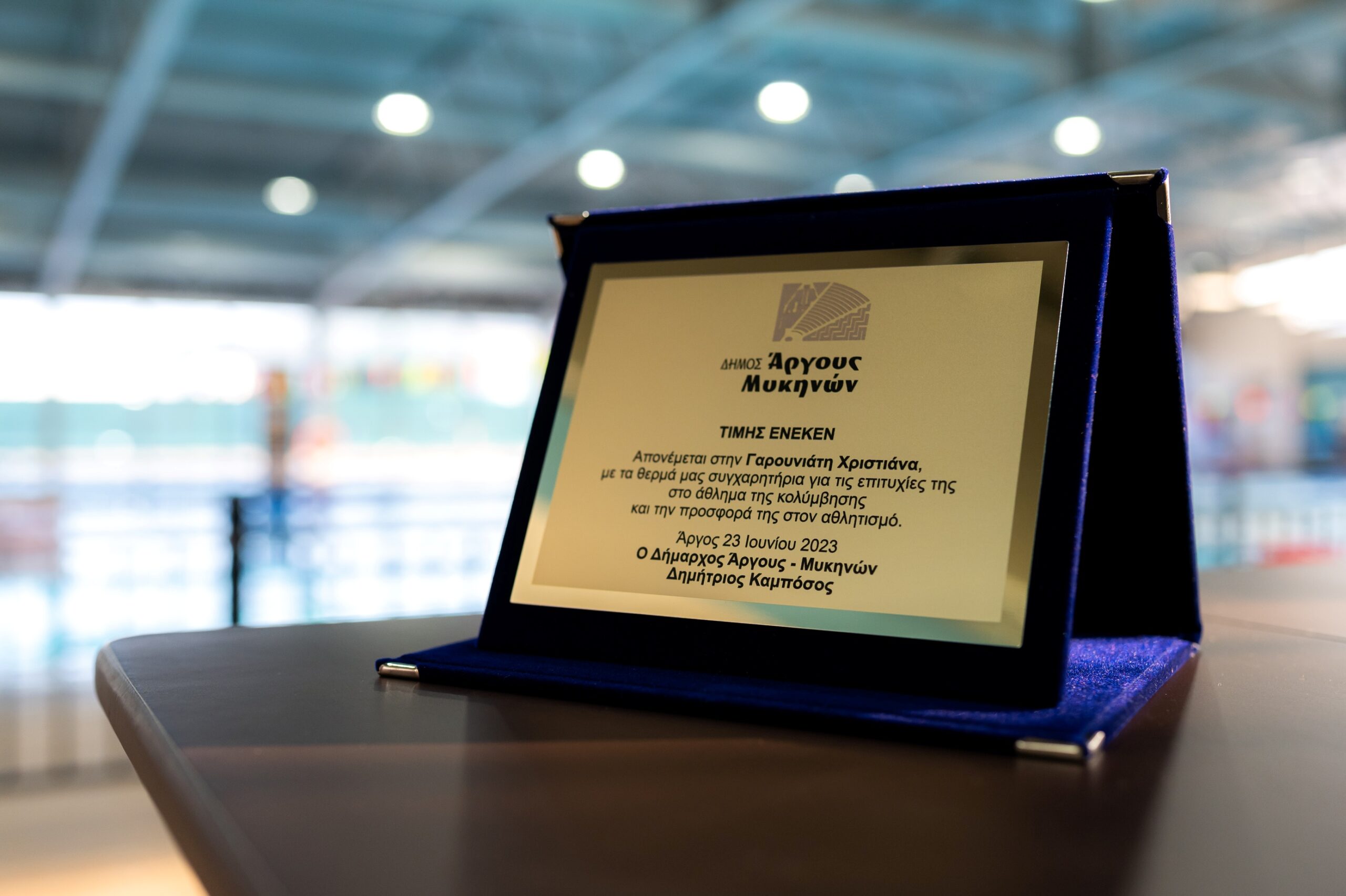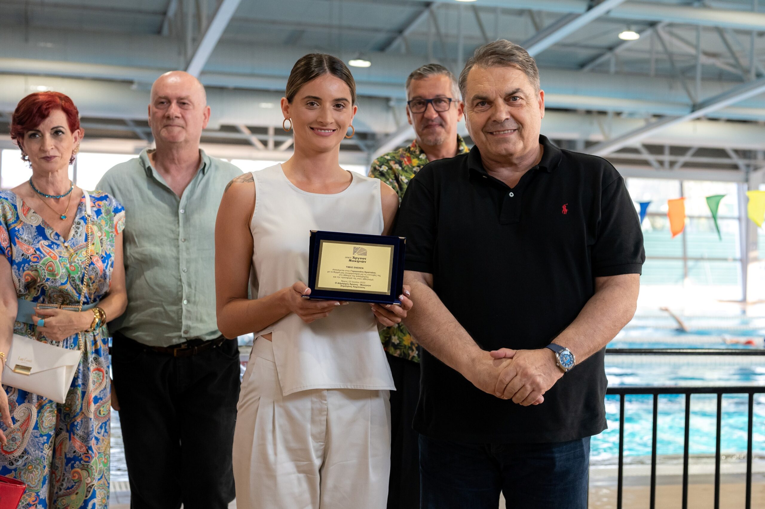 Την Πανελληνιονίκη Κολύμβησης Χριστιάνα Γαρουνιάτη βράβευσε χθες το απόγευμα, στις εγκαταστάσεις του Κλειστού Κολυμβητηρίου Άργους, ο Δήμαρχος Άργους – Μυκηνών Δημήτρης Καμπόσος, για τις επιτυχίες της στο πρόσφατο Πανελλήνιο Πρωτάθλημα, αλλά και για την κατάρριψη του Πανελλήνιου ρεκόρ, που πέτυχε η αθλήτρια πριν λίγες ημέρες.