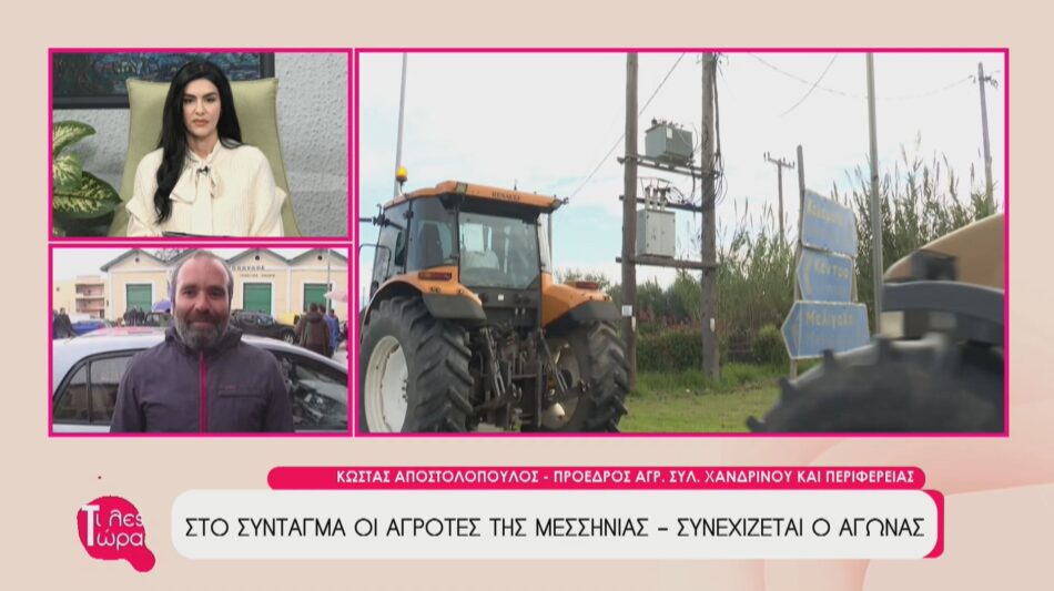 Στην εκπομπή «Τι λες τώρα» με την Αναστασία Μάντζαρη βρέθηκε καλεσμένος ο Πρόεδρος του Αγροτικού Συλλόγου Χανδρινού και Περιφέρειας, Κώστας Αποστολόπουλος, μεταφέροντας τον παλμό από το μεγάλο πανελλαδικό συλλαλητήριο στην Αθήνα. Σήμερα, Παρασκευή 13 Φεβρουαρίου, οι αγρότες της Μεσσηνίας έδωσαν το παρών στο Σύνταγμα, διεκδικώντας ουσιαστικές λύσεις για την επιβίωσή τους. Παρά τη λήξη των μπλόκων, ο αγώνας κλιμακώνεται με νέα μορφή και αμείωτη αποφασιστικότητα.