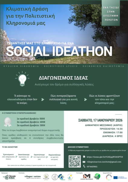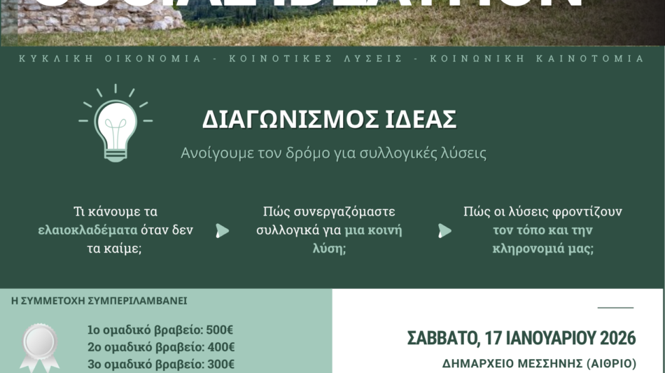 Με αυτά τα ερωτήματα ανοίγει ο συμμετοχικός διαγωνισμός ιδεών που διοργανώνεται το Σάββατο 17 Ιανουαρίου 2026 στο Δημαρχείο Μεσσήνης, με επίκεντρο τη διαχείριση των ελαιοκλαδεμάτων, τη συνεργασία σε τοπικό επίπεδο και τη σύνδεση της κλιματικής δράσης με την πολιτιστική κληρονομιά.