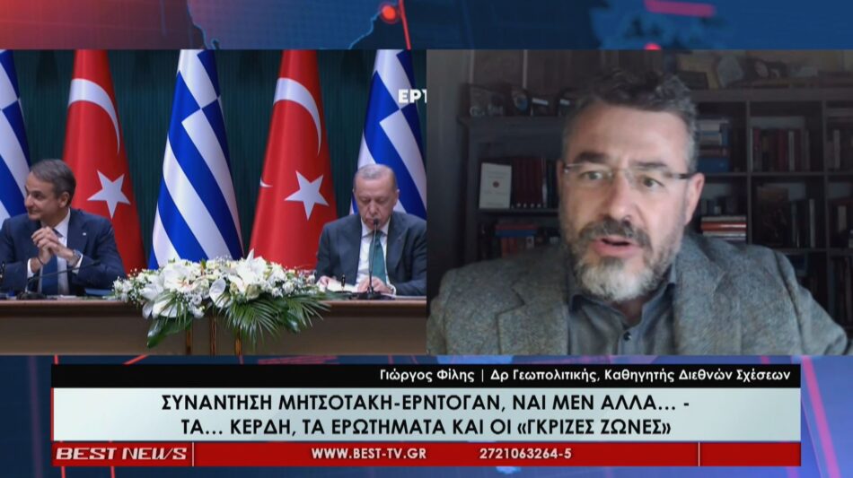 Τις διαστάσεις της συνάντησης Μητσοτάκη – Ερντογάν που δεν είναι μόνο αυτά που φάνηκαν στο προσκήνιο, αλλά και εκείνα που αφέθηκαν να εξελιχθούν ή και να εννοηθούν στο παρασκήνιο που φθάνουν μέχρι και τις ευρύτερες συμμαχίες και ισορροπίες στην περιοχή, αλλά και το ενδεχόμενο πολιτικό κόστος της στρατηγικής των «ήρεμων νερών» ανέλυσε ο Γιώργος Φίλης. Μιλώντας στο κεντρικό δελτίο ειδήσεων του BEST, ο Καθηγητής Διεθνών Σχέσεων και Διδάκτορας Γεωπολιτικής σημείωσε αρχικά πως «…φάνηκε το «θέλω» του Ερντογάν αυτή τη στιγμή» και, όπως είπε, «ο Ερντογάν δεν θέλει να δημιουργήσει κάποιο ζήτημα αυτή τη στιγμή με την Ελλάδα». Συνδέοντας τη στάση της Ελλάδας με τις επόμενες εθνικές εκλογές, εκτίμησε ότι η ελληνική κυβέρνηση προτίθεται «να χρησιμοποιήσει τα “ήρεμα νερά” και τη λειτουργική σχέση – όπως την ονομάζει -με την Τουρκία ως ένα “χαρτί” στο οποίο θα προσπαθήσει να πείσει τους Έλληνες ότι πάμε καλά στα Ελληνοτουρκικά».