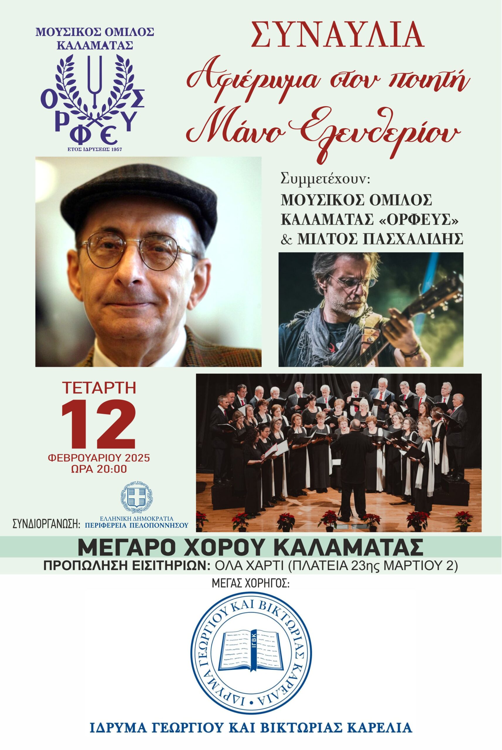 Ο Μουσικός Όμιλος Καλαμάτας «ΟΡΦΕΥΣ» οργανώνει μια ξεχωριστή συναυλία αφιερωμένη στο έργο του μεγάλου στιχουργού/ποιητή Μάνου Ελευθερίου, την Τετάρτη 12 Φεβρουαρίου 2025, στις 20:00, στο Μέγαρο Χορού Καλαμάτας.