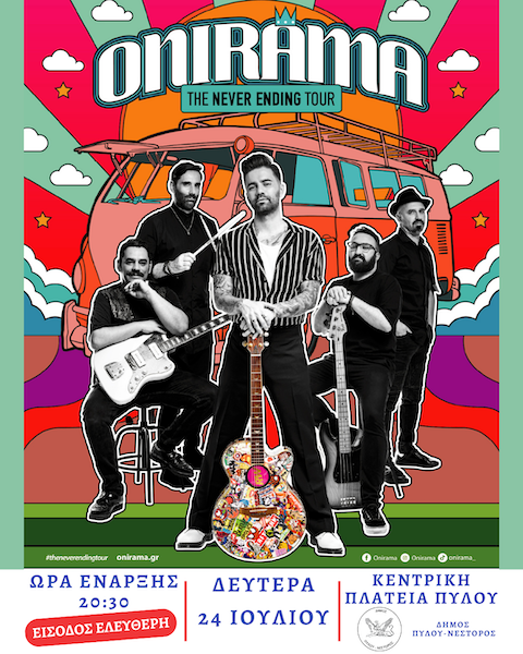 Οι “Onirama”, το πιο δυναμικό συγκρότημα, με τις δεκάδες διαχρονικές επιτυχίες, επιστρέφουν για ακόμα ένα καλοκαίρι στην αγαπημένη τους συνήθεια: ξαναβγαίνουν στο δρόμο, σε μια καλοκαιρινή περιοδεία γεμάτη δυναμισμό, κέφι και ενέργεια! Έχοντας πραγματοποιήσει πάνω από 4.000 εμφανίσεις συνολικά στην καριέρα τους, οι “Onirama” είναι αναμφισβήτητα η μπάντα με τα περισσότερα live σε Ελλάδα και Κύπρο! Η μεγάλη συναυλία θα δοθεί με ελεύθερη είσοδο τη Δευτέρα 24 Ιουλίου στις 8.30 μ.μ. στην Κεντρική Πλατεία Πύλου, από το Δήμο Πύλου – Νέστορος.