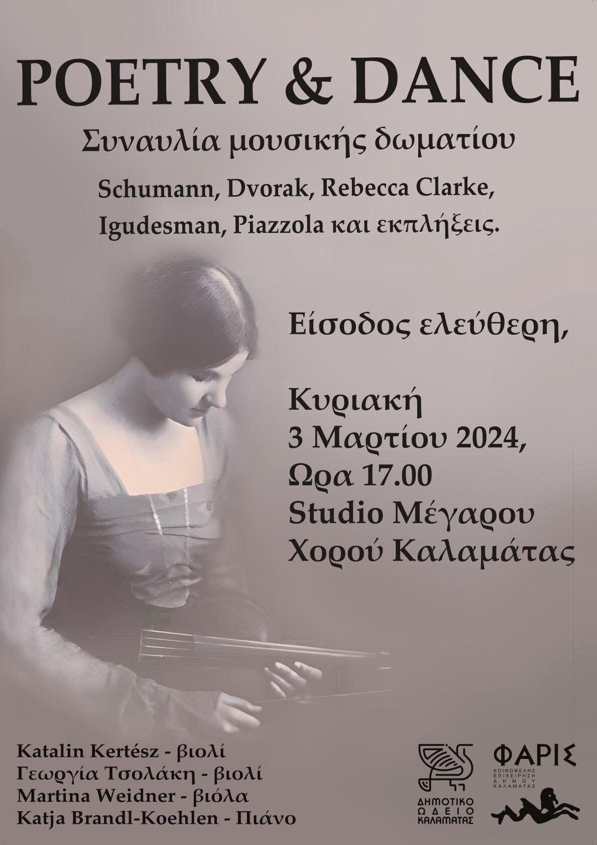 Με ελεύθερη είσοδο και ποικιλία από εξαίσιες μουσικές ερμηνευόμενες από την Katalin Kertész και την Γεωργία Τσολάκη στο βιολί, την Martina Weidner στην βιόλα και την Katja Brandl-Koehlen στο πιάνο, το Δημοτικό Ωδείο Καλαμάτας παρουσιάζει την Κυριακή 3 Μαρτίου 2024 και ώρα 17.00 στο studio του Μεγάρου Χορού Καλαμάτας μια απογευματινή συναυλία.