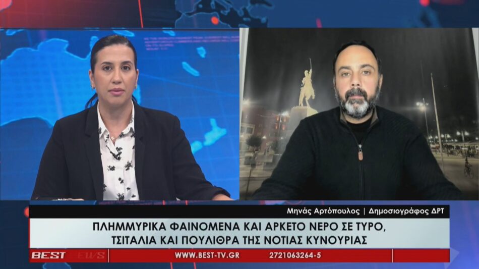 Πλημμυρικά φαινόμενα και αρκετό νερό σε Τυρό, Τσιτάλια και Πούλιθρα της Νότιας Κυνουρίας, έφερε η κακοκαιρία Buron με τα φαινόμενα πιο ήπια συγκριτικά με άλλες πληγείσες περιοχές της Πελοποννήσου. Το θέμα σχολίασε στο κεντρικό δελτίο ειδήσεων του Best ο δημοσιογράφος του ΔΡ Τρίπολης, Μηνάς Αρτόπουλος.
