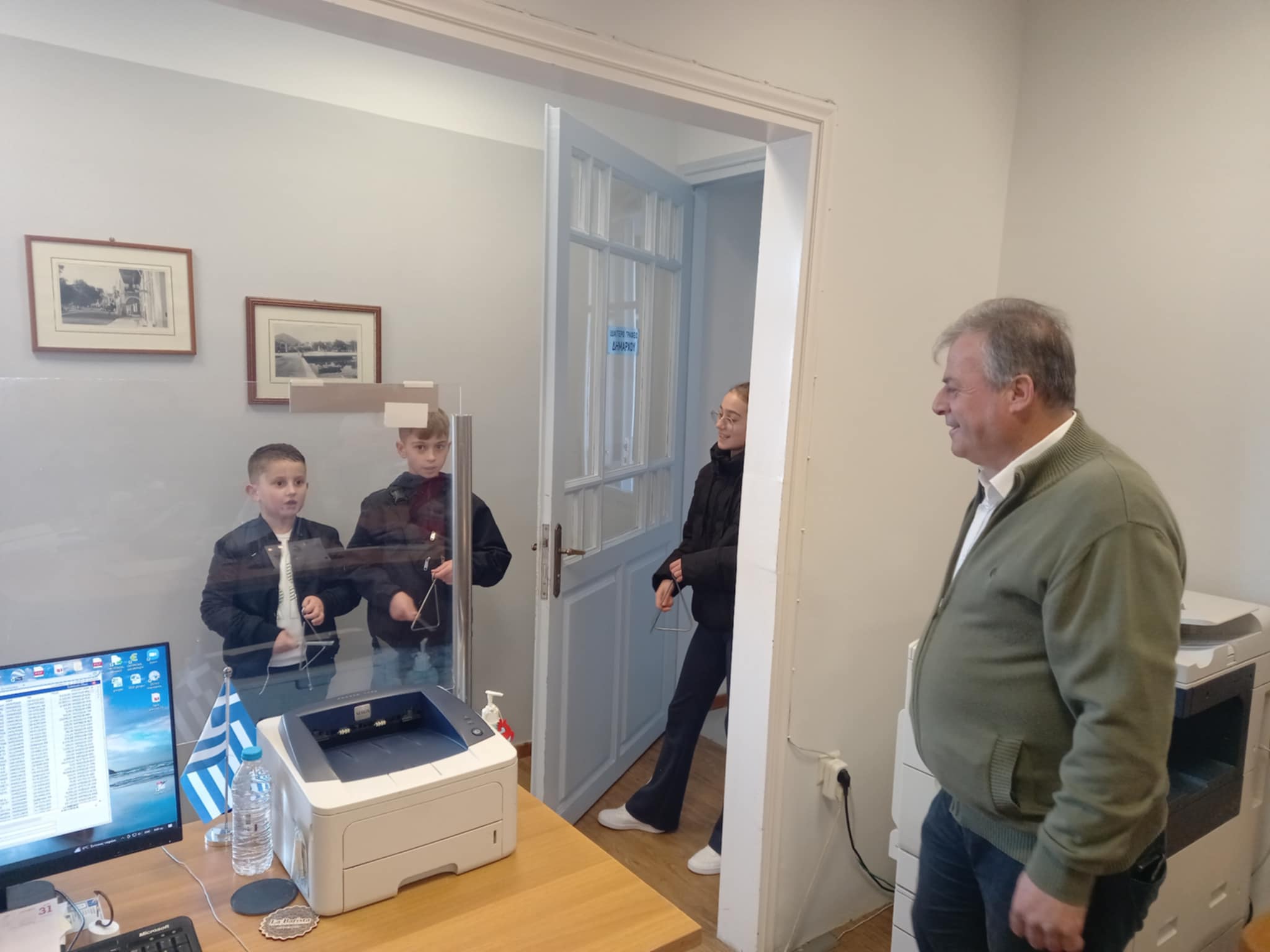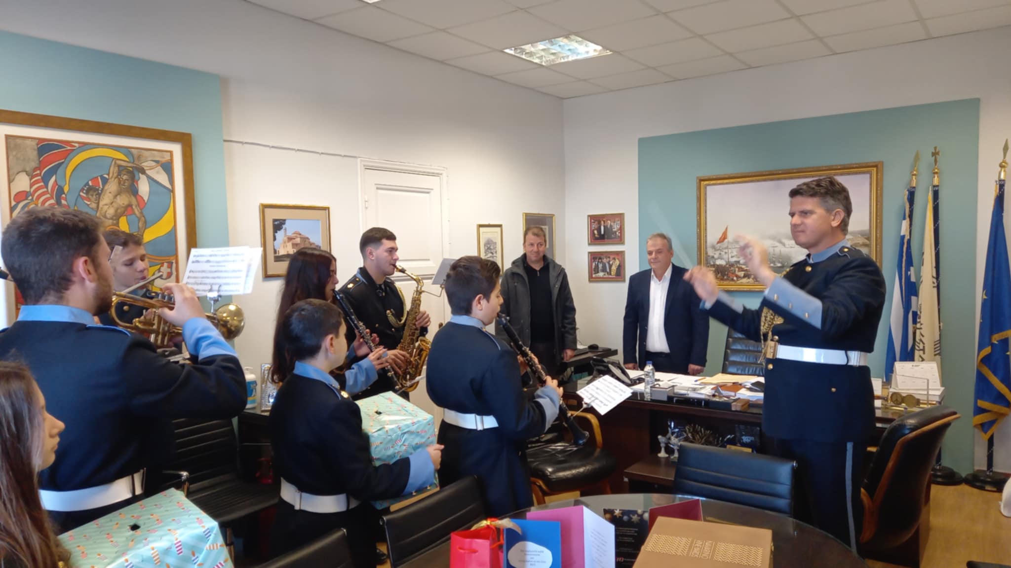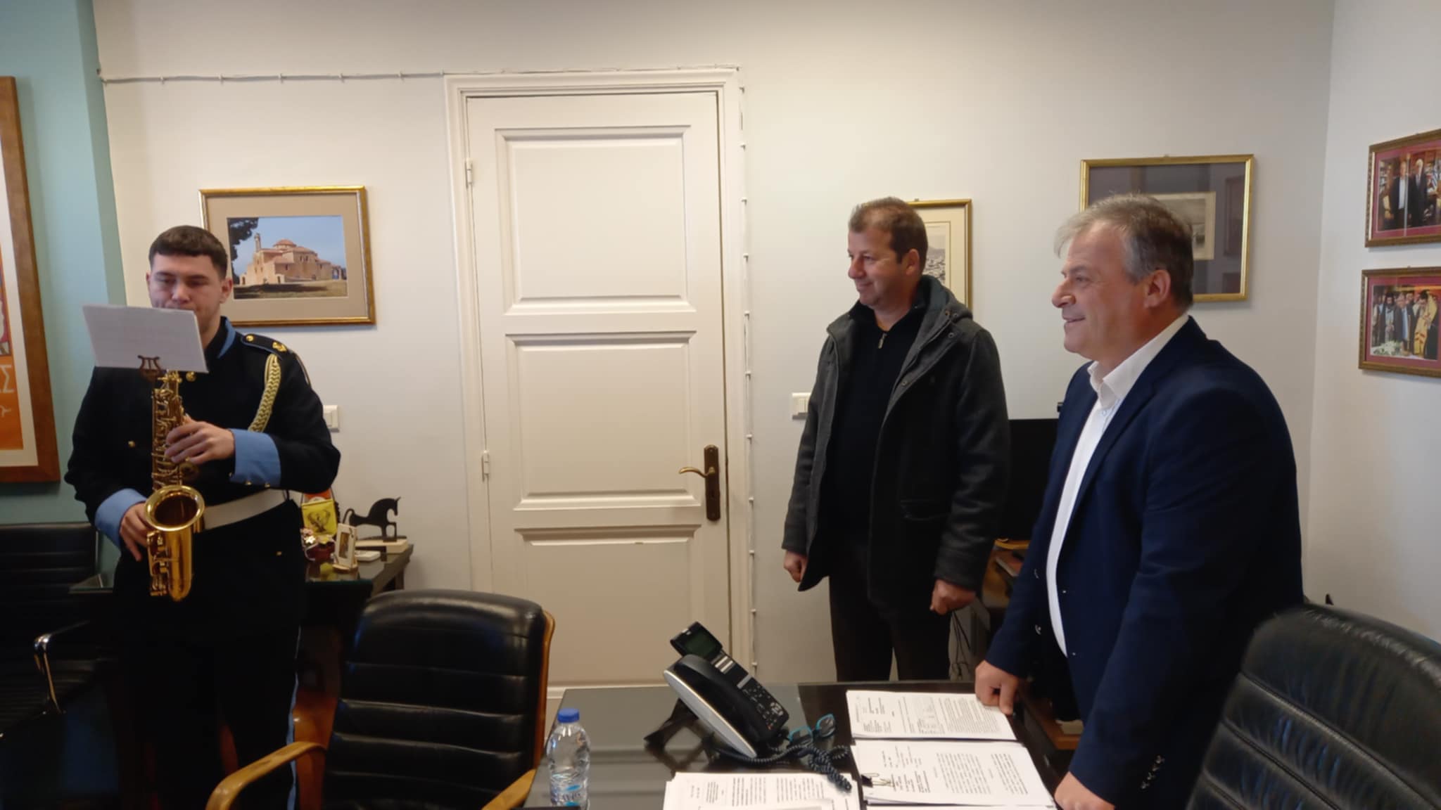 Τα παιδιά της Φιλαρμονικής συνοδευόμενα από το μαέστρο Γιάννη Σταθόπουλο βρέθηκαν το πρωί στο Δημαρχείο, όπου τους υποδέχθηκε ο Δήμαρχος Παναγιώτης Καρβέλας, ο Αντιδήμαρχος Γιώργος Κουφόγιωργας, αλλά και Δημοτικοί Υπάλληλοι.