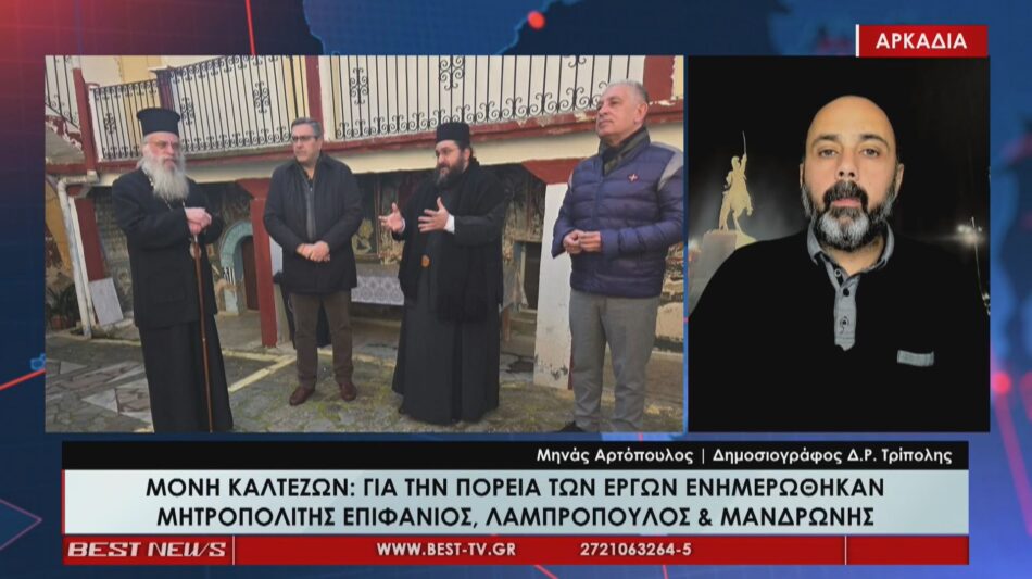 Οι εξελίξεις γύρω από την Μονή Καλτεζών και την ενημέρωση που έλαβαν για την πορεία των έργων ο Μητροπολίτης Επιφάνιος και οι Λαμπρόπουλος και Μανδρώνης βρέθηκαν ψηλά στην ατζέντα της σημερινής στήλης «Τα νέα της Αρκαδίας» σε σχολιασμό του Μηνά Αρτόπουλο στο κεντρικό δελτίο ειδήσεων του BEST.