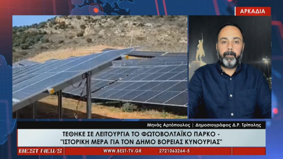 Ο Δήμος Βόρειας Κυνουρίας εγκαινίασε το νέο φωτοβολταϊκό πάρκο, τη μεγαλύτερη επένδυση που έχει πραγματοποιηθεί ποτέ από τον δήμο. Η παραγωγή ενέργειας θα συμβάλλει σε σημαντική εξοικονόμηση πόρων, οδηγώντας τον δήμο πιο κοντά στην ενεργειακή αυτάρκεια και τη βιώσιμη ανάπτυξη.