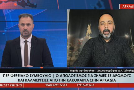Στη στήλη τα «Νέα της Αρκαδίας» που προβάλλεται καθημερινά στο κεντρικό δελτίο ειδήσεων της τηλεόρασης BEST, ψηλά στην ατζέντα της Πέμπτης βρέθηκαν η εκλογή του νέου Μητροπολίτη Μαντινείας Κυνουρίας που θα πραγματοποιηθεί στις 4 Οκτωβρίου, η πορεία των έργων στην πλατεία της Αγίας Βαρβάρας αλλά και η επίσκεψη του Υφυπουργού Προστασίας του Πολίτη στην Τρίπολη.