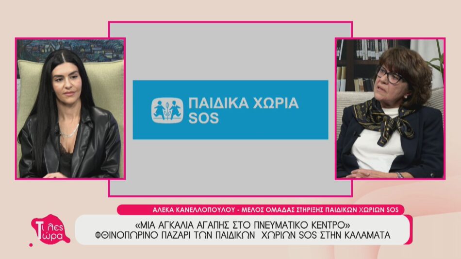Η Αλέκα Κανελλοπούλου, Μέλος Ομάδας Στήριξης των Παιδικών Χωριών SOS, καλεσμένη στην εκπομπή ‘’Τι Λες Τώρα’’ με την Αναστασία Μάντζαρη, μίλησε για το παζάρι που διοργανώνουν με χρηστικά και διακοσμητικά αντικείμενα από τις 30 Οκτωβρίου έως τις 2 Νοεμβρίου 2025, στο Πνευματικό Κέντρο Καλαμάτας, αλλά και για την δράση στήριξης των Παιδικών Χωριών SOS σε Παιδιά και Οικογένειες στην Μεσσηνία.