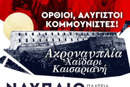 ΔΕΛΤΙΟ ΤΥΠΟΥ Μεγάλη εκδήλωση με ομιλία του ΓΓ της ΚΕ του ΚΚΕ Δημήτρη Κουτσούμπα θα πραγματοποιήσει η Οργάνωση Περιοχής Πελοποννήσου το Σάββατο 18 Απρίλη στο Ναύπλιο, στις 7.30 μ.μ. στην πλατεία Δημαρχείου, τιμώντας τους χιλιάδες κομμουνιστές που ήταν φυλακισμένοι στην Ακροναυπλία και ορισμένοι εκτελέστηκαν στο Σκοπευτήριο της Καισαριανής την 1η Μάη 1944 από τους