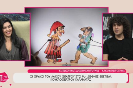 Ο αγαπημένος Καραγκιοζοπαίχτης Κωνσταντίνος Δημητρακόπουλος , καλεσμένος στην εκπομπή ''Τι Λες Τώρα'' με την Αναστασία Μάντζαρη, μιλά για τις παραστάσεις «ΜΑΥΡΟΜΑΤΙΚΑ ΦΑΣΟΛΙΑ!» και «Τσαλακοσκούφης ο Λαμπερότερος» που θα παιχτούν στο φετινό 9ο διεθνές φεστιβάλ κουκλοθεάτρου Καλαμάτας. https://youtu.be/iojghRUHuzg?t=5779