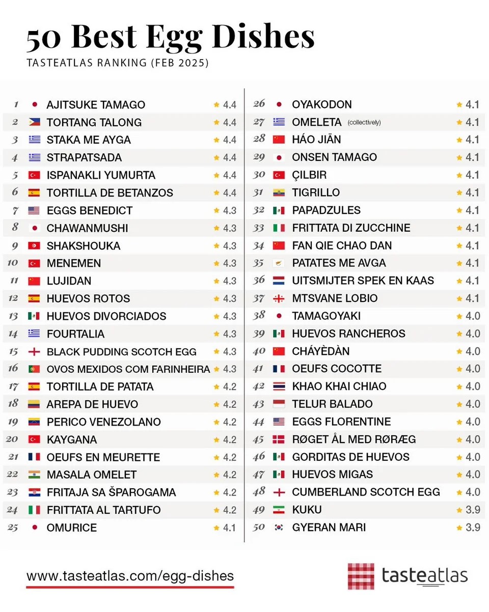 Το Taste Atlas μοιράστηκε για ακόμη μία φορά την λίστα του με τα 50 τοπ πιάτα με αυγά στον κόσμο.
