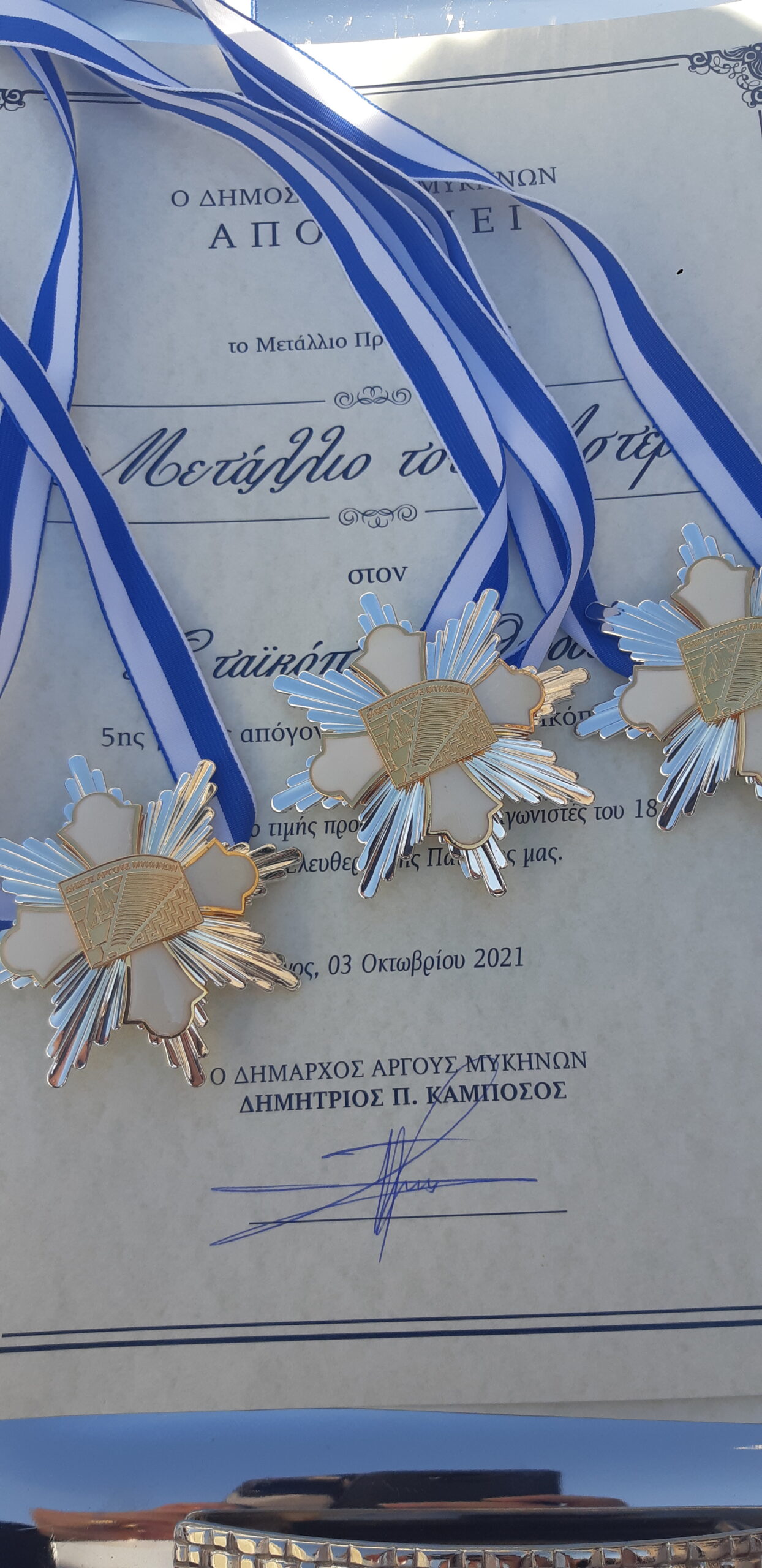 Ο Δήμαρχος Άργους Μυκηνών κ. Δημήτρης Καμπόσος τίμησε σήμερα Κυριακή 3 Οκτωβρίου, τα μέλη του Πατριωτικού Ομίλου των απογόνων αγωνιστών του 1821 και ιστορικών γενών της Ελλάδος, όπου και απένειμε το μετάλλιο του αστέρα. Με το πέρας της τέλεσης της δοξολογίας στον Ιερό Ναό Αγίου Πέτρου, πραγματοποιήθηκε η τελετή μεταλλιοδοσίας στον εξωτερικό χώρου του Παλαιού Δημαρχείου Άργους.