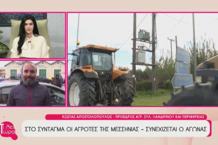 Στην εκπομπή «Τι λες τώρα» με την Αναστασία Μάντζαρη βρέθηκε καλεσμένος ο Πρόεδρος του Αγροτικού Συλλόγου Χανδρινού και Περιφέρειας, Κώστας Αποστολόπουλος, μεταφέροντας τον παλμό από το μεγάλο πανελλαδικό συλλαλητήριο στην Αθήνα. Σήμερα, Παρασκευή 13 Φεβρουαρίου, οι αγρότες της Μεσσηνίας έδωσαν