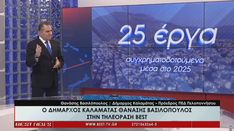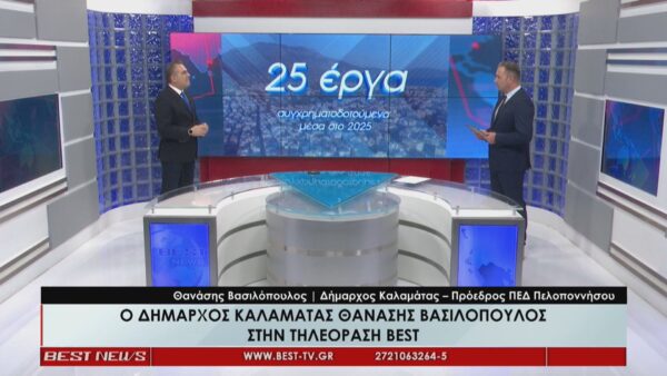 Ο Πρόεδρος της ΠΕΔ Πελοποννήσου και Δήμαρχος Καλαμάτας, μιλώντας στο κεντρικό δελτίο ειδήσεων του BEST, εστίασε σε 25 έργα συγχρηματοδοτούμενα που ολοκληρώθηκαν μέσα στο 2025 τα οποία χαρακτήρισε «πάρα πολύ σημαντικά, που ξεκινούν από έργα μικρά όπως 150.000€ η ανακαίνιση στο ΚΕΠ μέχρι έργα 3 εκατομμυρίων όπως είναι ο αγωγός ύδρευσης Β΄ φάση μες την πόλη!», αναφέροντας επιγραμματικά από έργα ύδρευσης μέχρι αστικές αναπλάσεις. «Μέσα στο 2025 άλλαξαν 20.000 τ.μ που αυτό σημαίνει βελτίωση ποιότητας ζωής, προσβασιμότητα, φιλικά πεζοδρόμια, φιλικοί δρόμοι, πράσινο, smart εφαρμογές», ανάφερε ο δήμαρχος δίνοντας έμφαση στα όσα έχουν γίνει για να αλλάξουν την καθημερινότητα των δημοτών. Απαντώντας και στο θέμα των χώρων στάθμευσης που αναδεικνύεται μέσω των αναπλάσεων, εξηγώντας πως «Δεν μειώνονται οι θέσεις. Καταργούνται οι παράνομες θέσεις στάθμευσης», απαριθμώντας και τις πρωτοβουλίες που έχουν αναληφθεί για την αντιμετώπιση του ζητήματος. Δράττοντας της ευκαιρίας να αναφερθεί στο Σχέδιο Βιώσιμης Αστικής Κινητικότητας «Ήδη έχουμε στα χέρια μας το ΣΒΑΚ, έχουμε τη μελέτη στάθμευσης και θα ακολουθήσει η κυκλοφοριακή μελέτη μέσα στους πρώτους μήνες του 2026». Βασικός βραχίονας της πολιτικής του δήμου Καλαμάτας παραμένει η ΔΕΥΑΚ, με τον κ. Βασιλόπουλο να εκφράζει ικανοποίηση για τον ρυθμό υλοποίησης του Τεχνικού Προγράμματος. Ως πλέον κομβικό το έργο αντικατάστασης των 26 χλμ με νέο αγωγό ύδρευσης μέσα στην Καλαμάτα, έργο που ολοκληρώθηκε μέσα στο 2025. «ένα πάρα πολύ σπουδαίο έργο» και όπως τόνισε δεν είναι μόνον αυτό. «2.400.000€ είναι η ενεργειακή αναβάθμιση του Βιολογικού Καθαρισμού, 2,2 εκατ. ευρώ τα δύο φωτοβολταϊκά πάρκα, κάναμε ενεργειακή αναβάθμιση και ανακατασκευάσαμε ολοκληρωτικά το κολυμβητήριο Καλαμάτας, ανασκευάσαμε το διώροφο κτίριο της Πρώην Ηλεκτρικής Εταιρείας, ολοκληρώσαμε το Κέντρο Ημερήσιας Φροντίδας Ηλικιωμένων. 25 έργα μέσα στο 2025 που δεν μπορεί κανείς να το αμφισβητήσει»