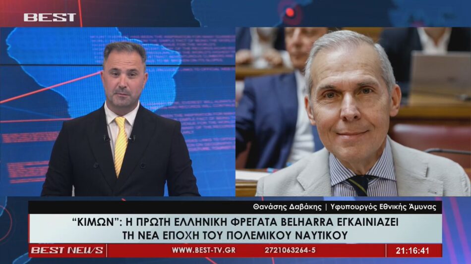 Ως μια στιγμή εθνικής υπερηφάνειας χαρακτήρισε ο υφυπουργός Εθνικής Άμυνας την ύψωση της Ελληνικής σημαίας στην πρώτη από τις τέσσερις φρεγάτες Belh@rra, τη φρεγάτα “Κίμων”», στο ναυπηγείο του Λοριάν. «Αυτό έγινε εχθές το μεσημέρι στη Λοριάν της Γαλλίας όπου υψώθηκε η Γαλανόλευκη στο ιστίο του Κίμωνα της πρώτης φρεγάτας Μπελαρά FDI, της δικτυοκεντρικής φρεγάτας του πολεμικού ναυτικού. Αυτό είναι ένα σταθερό βήμα, αυτό που έγινε εχθές προς την ενίσχυση και την ανανέωση του εθνικού μας στόλου, του στόλου επιφανείας. Ενός γεγονότος το οποίο κυρίως υλοποιείται από το υστέρημα του ελληνικού λαού ο οποίος ελληνικός λαός χρηματοδοτεί όλα τα εξοπλιστικά προγράμματα και όλη την ανανέωση όχι μόνο στη θάλασσα αλλά και στον αέρα με την πολεμική μας αεροπορία, με τις αναβαθμίσεις των F-16, τις προσθήκης των Rafale και την μελλοντική πρόσκληση των F-35 των αεροσκαφών 5ης γενιάς», είπε Θανάσης Δαβάκης μιλώντας στο κεντρικό δελτίο ειδήσεων του BEST.