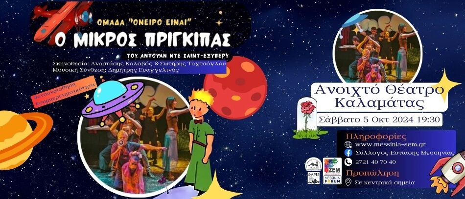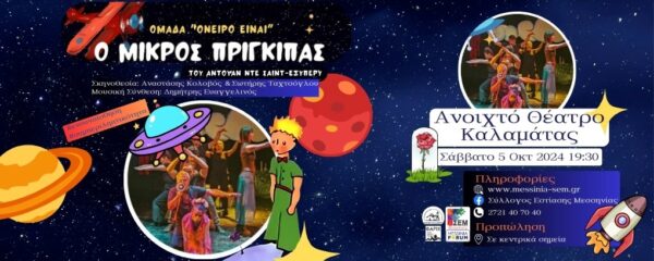 “Ο ΜΙΚΡΟΣ ΠΡΙΓΚΙΠΑΣ” του Αντουάν ντε Σαιντ-Εξυπερύ, έπειτα από την πρεμιέρα του στον κήπο του Μεγάρου Μουσικής, το καλοκαίρι του 2023, στο Bobos Arts Festival και τα συνεχόμενα sold out στα Θέατρα «Από Μηχανής» και  Αλκμήνη» ταξιδεύει στην Καλαμάτα. Η ομάδα “Όνειρο είναι” θα είναι εκεί για να τον υποδεχτεί και να ξεδιπλώσει την όμορφη ιστορία του. Σας περιμένουμε για ένα μαγικό ταξίδι στον κόσμο του μικρού πρίγκιπα. Ελάτε να ανακαλύψουμε με τους μικρούς μας φίλους τα νοήματα του έργου που έχουν να κάνουν με την φιλία, την αγάπη, την αφοσίωση, την αποδοχή, την αγάπη για το περιβάλλον αλλά κυρίως να εκπαιδεύσουμε τα παιδιά σε αυτό που δυστυχώς τα περισσότερα δεν μαθαίνουν μεγαλώνοντας… ΕΝΣΥΝΑΙΣΘΗΣΗ!