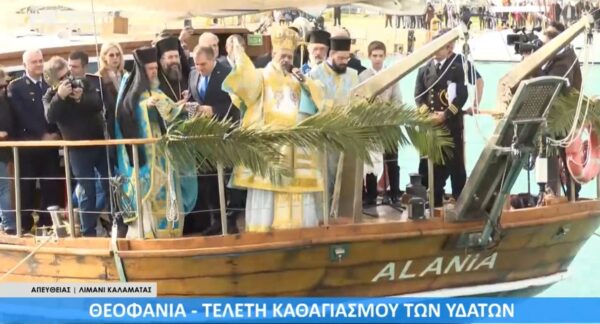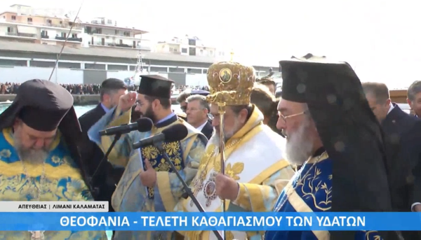 Σε ζωντανή μετάδοση από την τηλεόραση BEST προβάλλεται αυτή την ώρα ο Καθαγιασμός των Υδάτων και η Κατάδυση του Τιμίου Σταυρού, στο πλαίσιο του εορτασμού των Θεοφανίων, στο λιμάνι της Καλαμάτας.