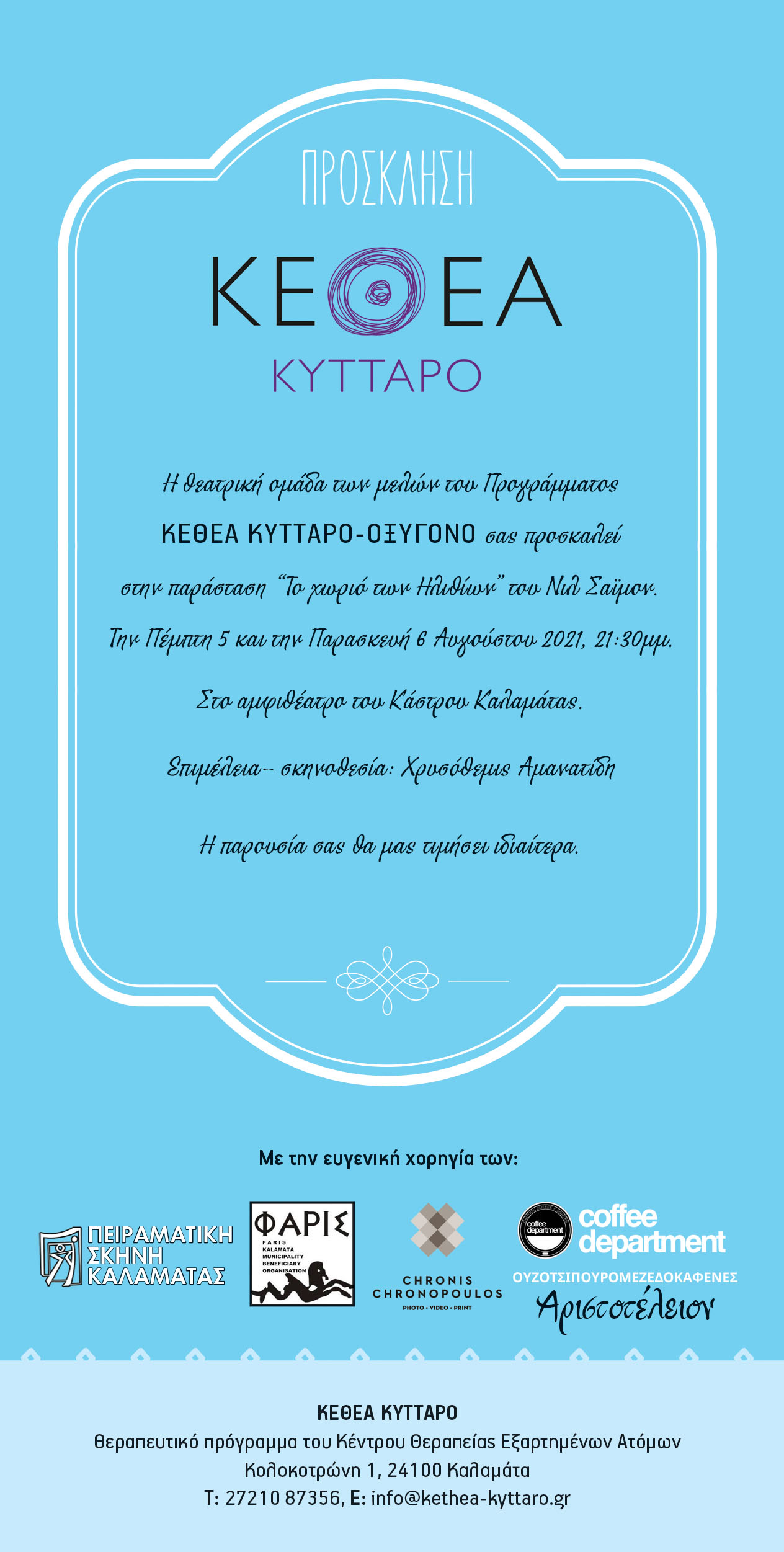 Ο χώρος του Αμφιθέατρου του Κάστρου παραχωρήθηκε από την Κοινωφελή Επιχείρηση του Δήμου Καλαμάτας «Φάρις». Χορηγοί της θεατρικής ομάδας είναι το «Coffee Department» και το «Αριστοτέλειον».