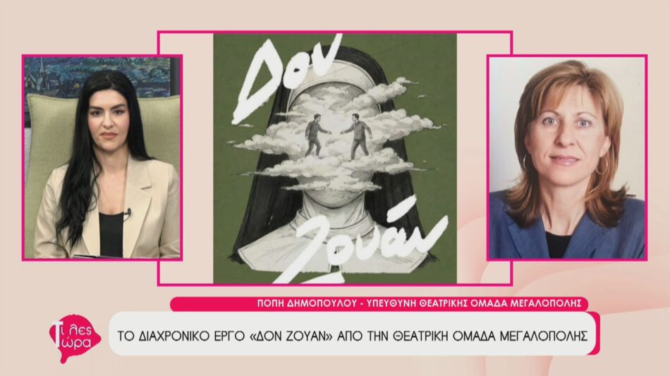 Η υπεύθυνη της Θεατρικής Ομάδας Μεγαλόπολης, Πόπη Δημοπούλου, φιλοξενήθηκε στην εκπομπή «Τι λες τώρα» με την Αναστασία Μάντζαρη, όπου μίλησε για την παράσταση «Δον Ζουάν». Το διαχρονικό έργο έκανε πρεμιέρα στις 28 Φεβρουαρίου και συνεχίζει το ταξίδι του στο Πνευματικό Κέντρο «Πολύβιος». Οι επόμενες παραστάσεις θα πραγματοποιηθούν στις 7, 8, 14 και 15 Μαρτίου, προσκαλώντας το κοινό σε μια μοναδική θεατρική εμπειρία.