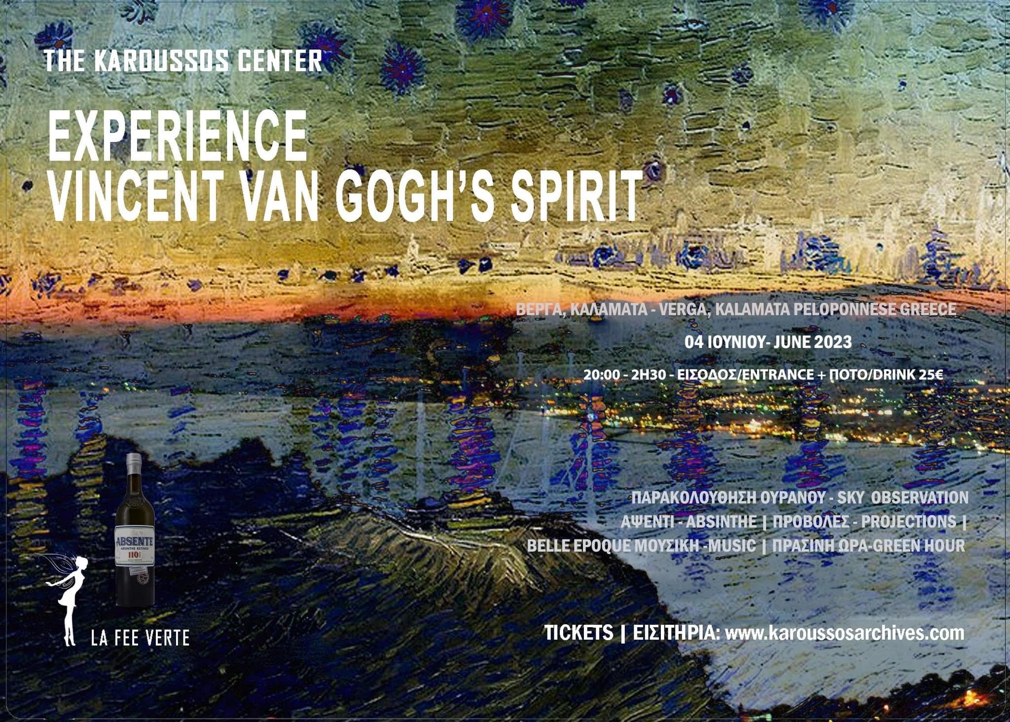 Στις 4 Ιουνίου 2023, στις 8.00μ.μ., ο Μαχαλάς του Κέντρου Καρούσου, στη Βέργα, μετατρέπεται στο φημισμένο μπαρ “La Fee Verte”, το στέκι του Van Gogh, για να φιλοξενήσει τους καλεσμένους σε ένα μαγικό σκηνικό, μια νύχτα με πανσέληνο. Το μήνα που ο Vincent Van Gogh δημιούργησε το εκπληκτικό πίνακα του «Έναστρη νύχτα», οι επισκέπτες μας, μπορούν να ζήσουν το παλμό του καλλιτέχνη απολαμβάνοντας το αγαπημένο του ποτό, το αψέντι, παρακολουθώντας το έργο του στο φυσικό περιβάλλον του, στην 360 ταράτσα του Κέντρου, κάτω από τους ήχους της Belle Epoque.