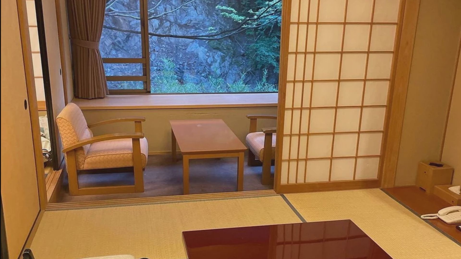 Τα τυπικά δωμάτια στο στο Nishiyama Onsen Keiunkan έχουν τρία τμήματα: δύο καθιστικά και έναν κύριο χώρο. Στους τοίχους κρέμονται παραδοσιακοί ιαπωνικοί κρεμαστοί πάπυροι που ονομάζονται kakejiku και απεικονίζουν εικόνες της φύσης με την υπογραφή του καλλιτέχνη γραμμένη με καλλιγραφία. Τα παράθυρα είναι τόσο μεγάλα που η θέα του δάσους μοιάζει με πίνακα του Μονέ που καλύπτει τον τοίχο. Ένα μεγάλο ποτάμι ρέει από κάτω και ο ατμός υποδηλώνει την παρουσία θερμών πηγών.