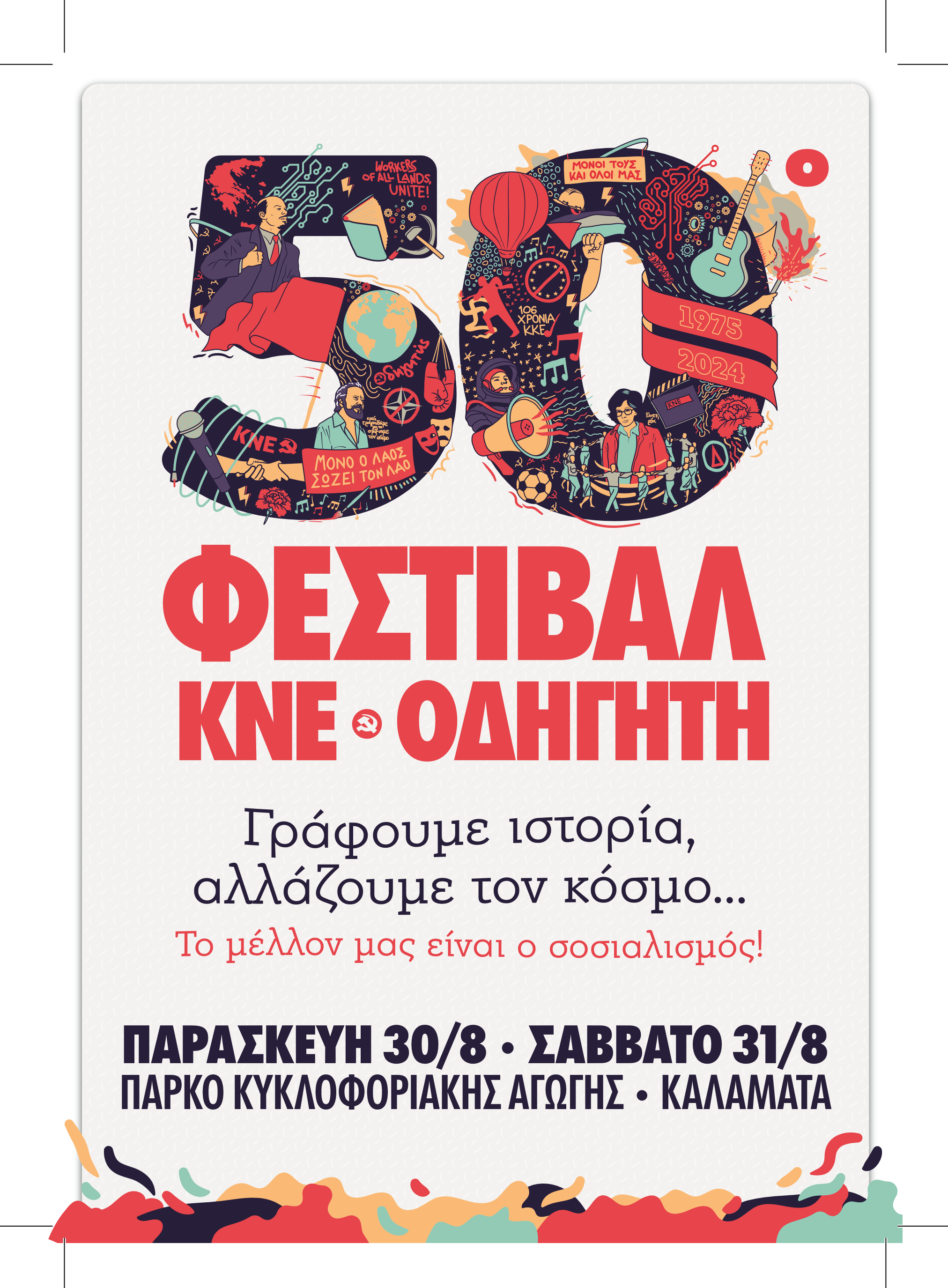 Με το σύνθημα «Γράφουμε ιστορία, αλλάζουμε τον κόσμο… Το μέλλον μας είναι ο σοσιαλισμός», θα πραγματοποιηθούν την Παρασκευή και το Σάββατο 30 – 31 Αυγούστου, στο Πάρκο Κυκλοφοριακής Αγωγής, οι εκδηλώσεις του 50ου Φεστιβάλ ΚΝΕ – ΟΔΗΓΗΤΗ στην Καλαμάτα.