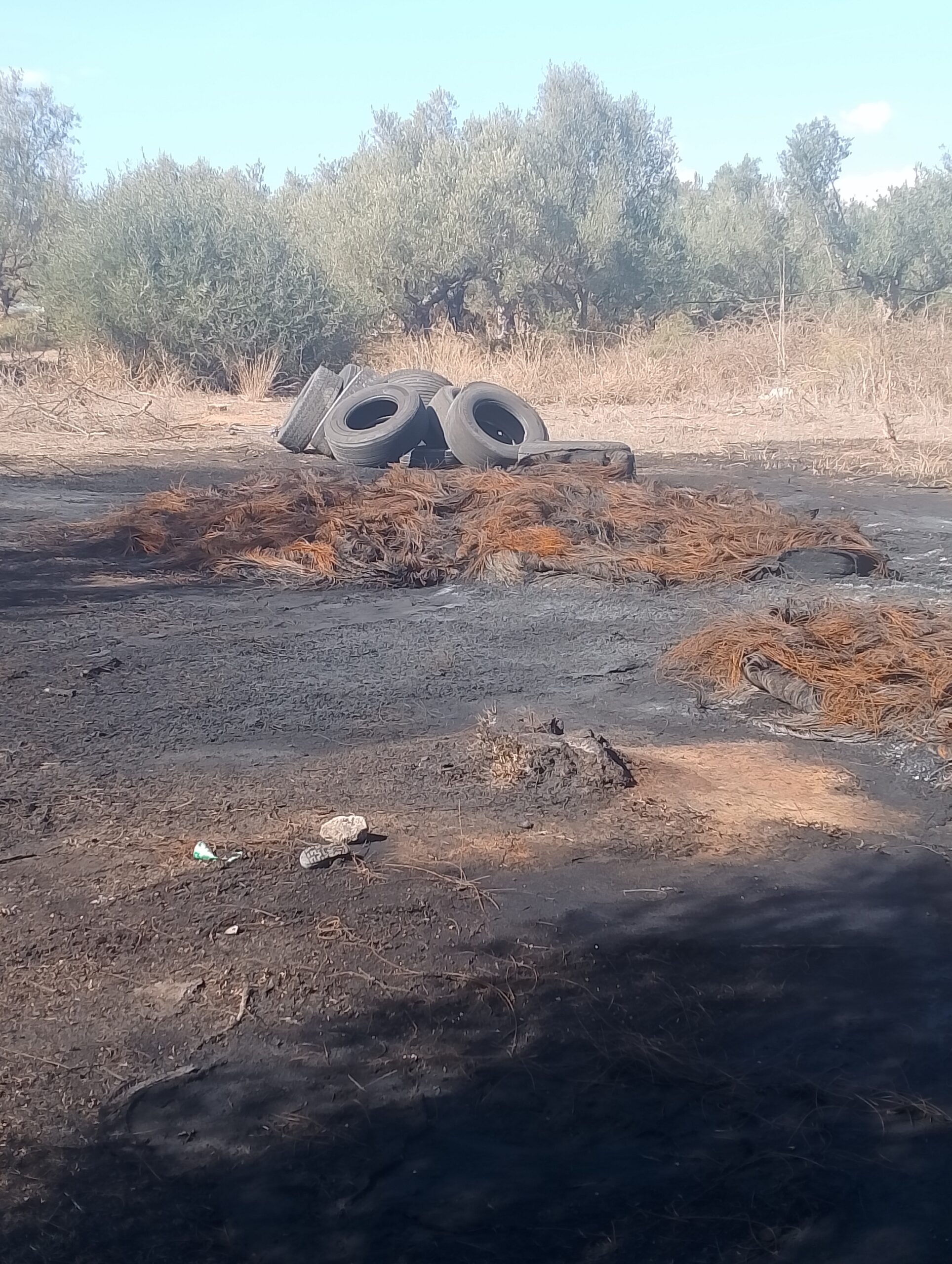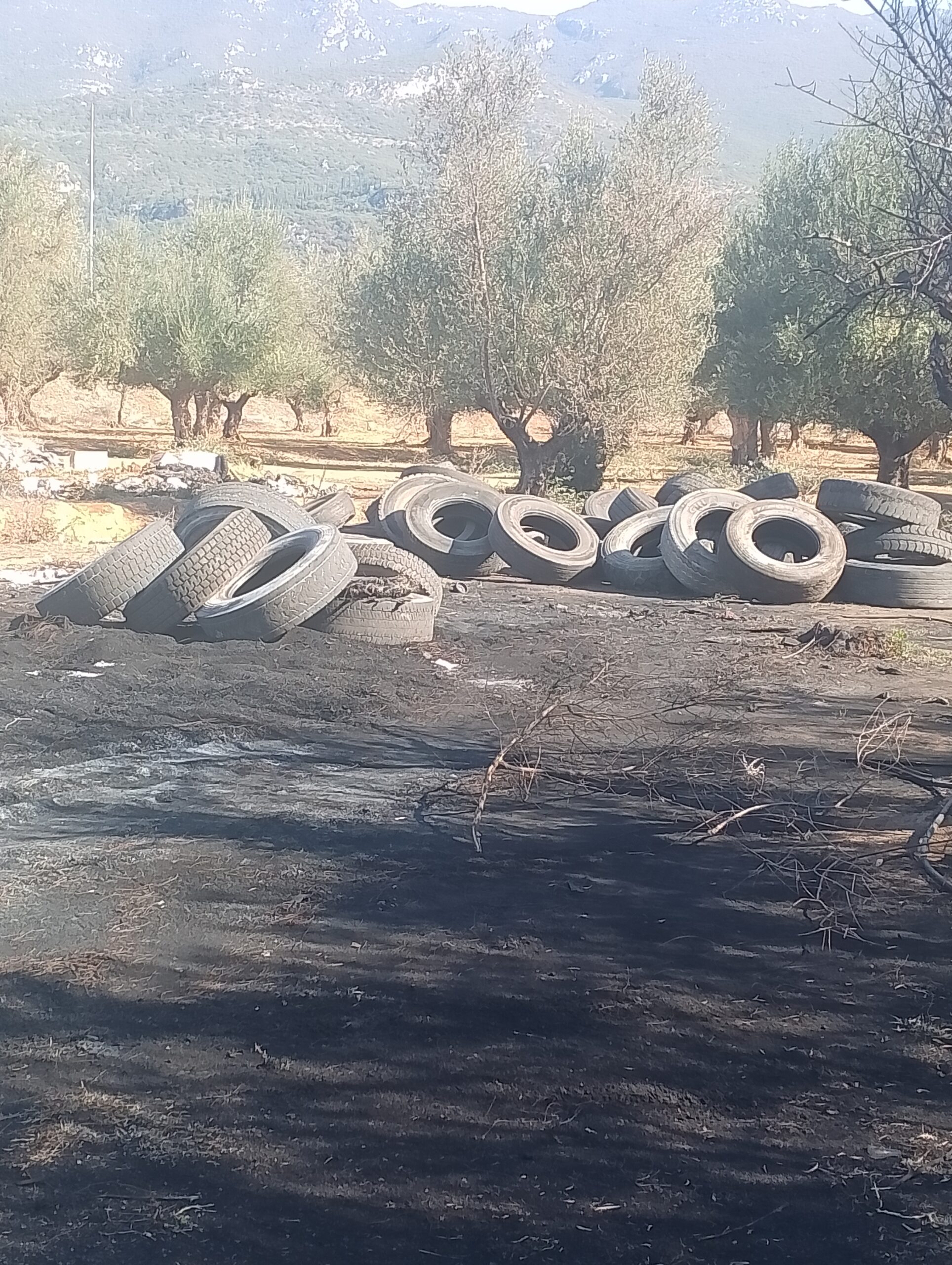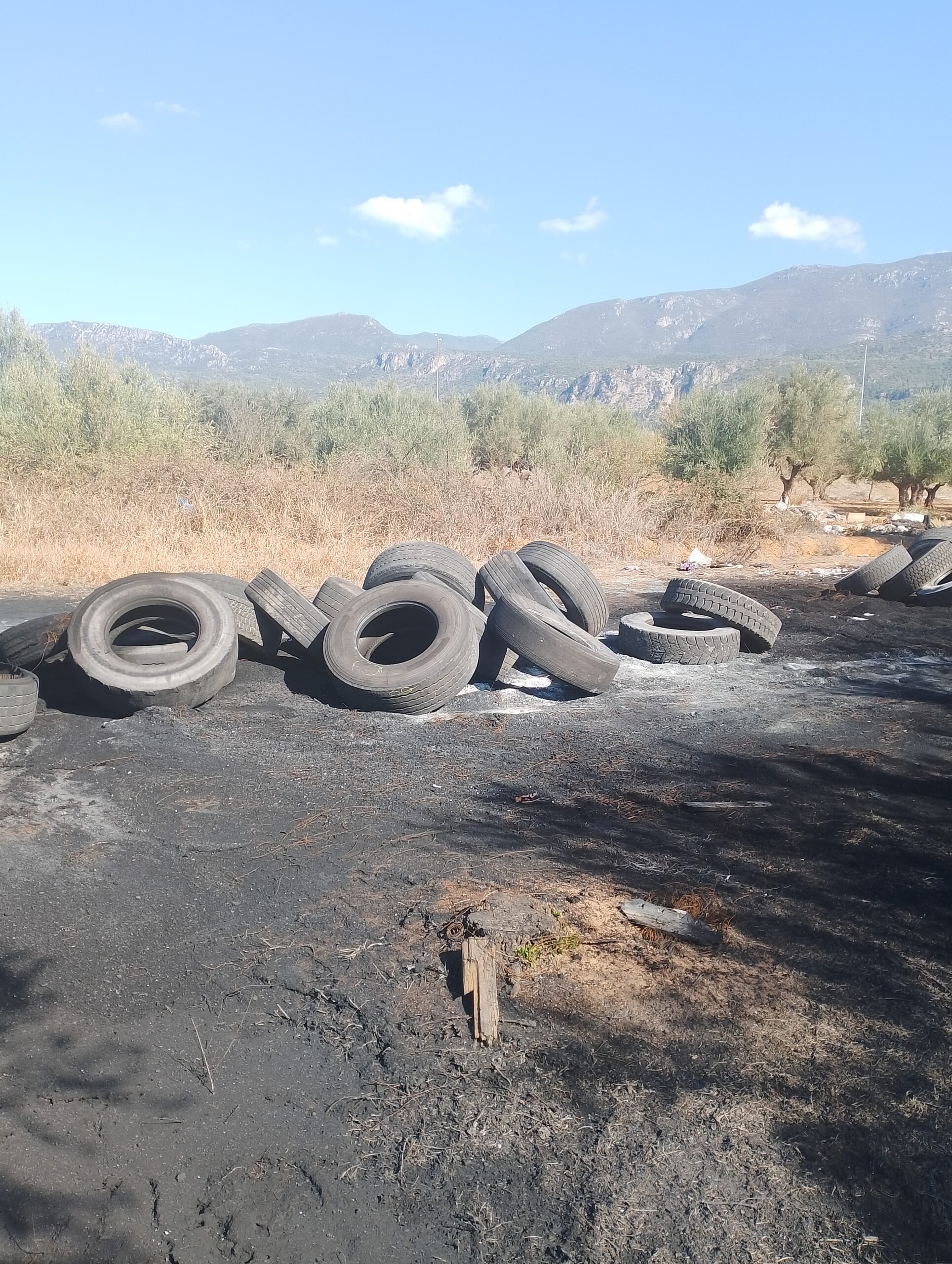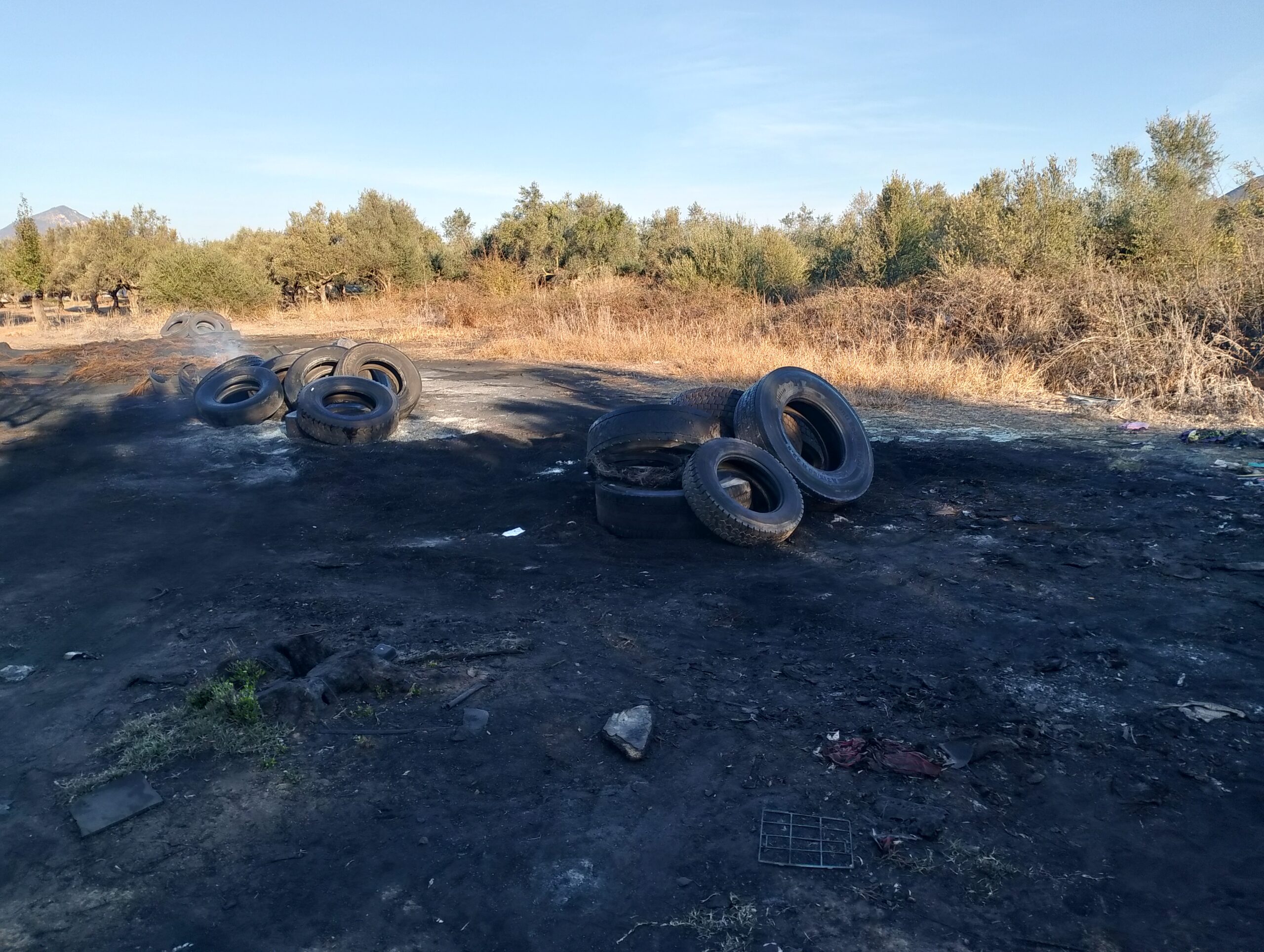 Ούτε ένας ούτε δυο αλλά τέσσερις σωροί με λάστιχα αυτοκινήτων και σε ορισμένα σημεία καμένα, με την εικόνα να θυμίζει χώρο απορριμμάτων και επ’ουδενί χωράφι με ελιές, με την μυρωδιά από τα καμένα λάστιχα ανυπόφορη.