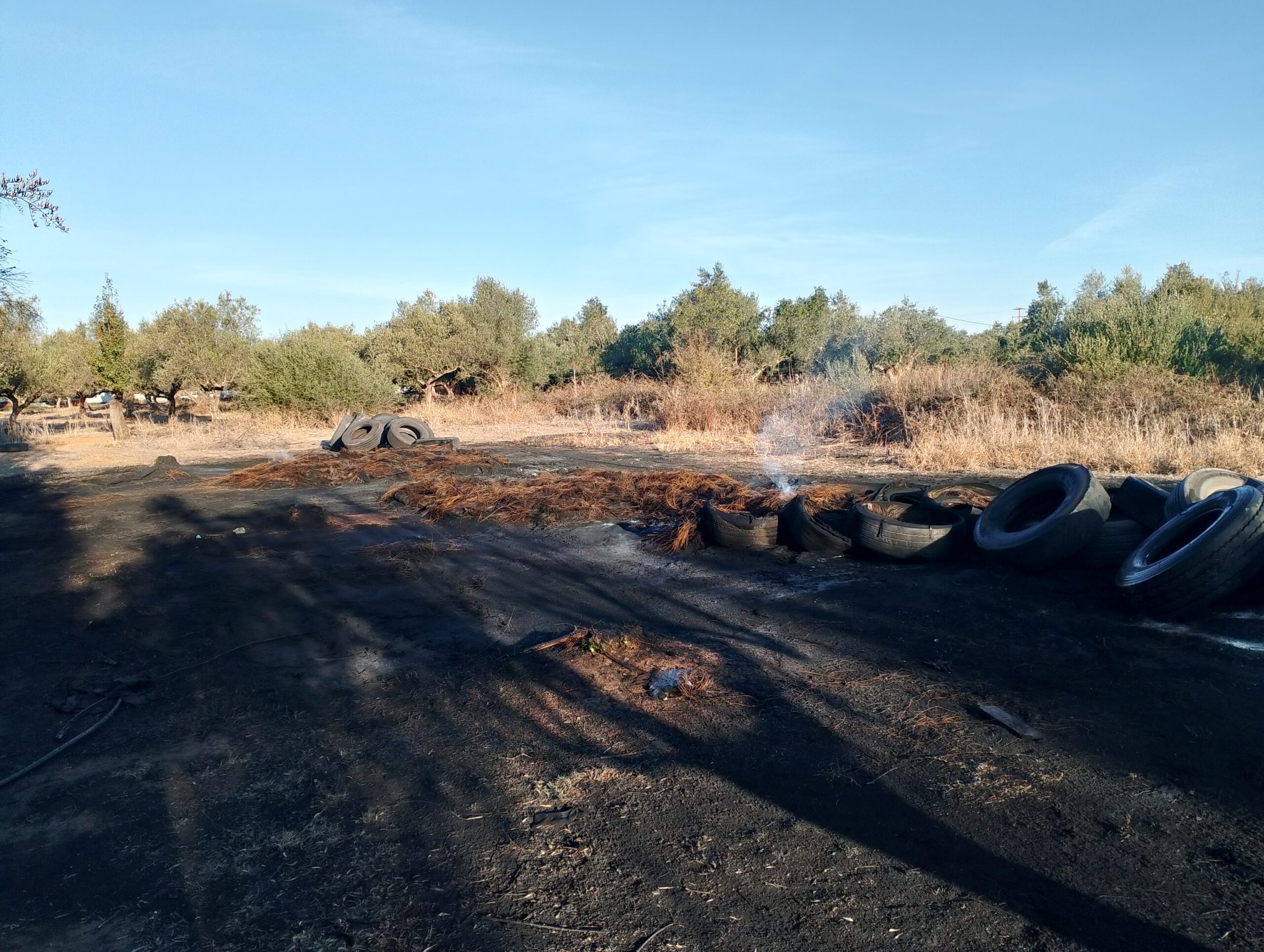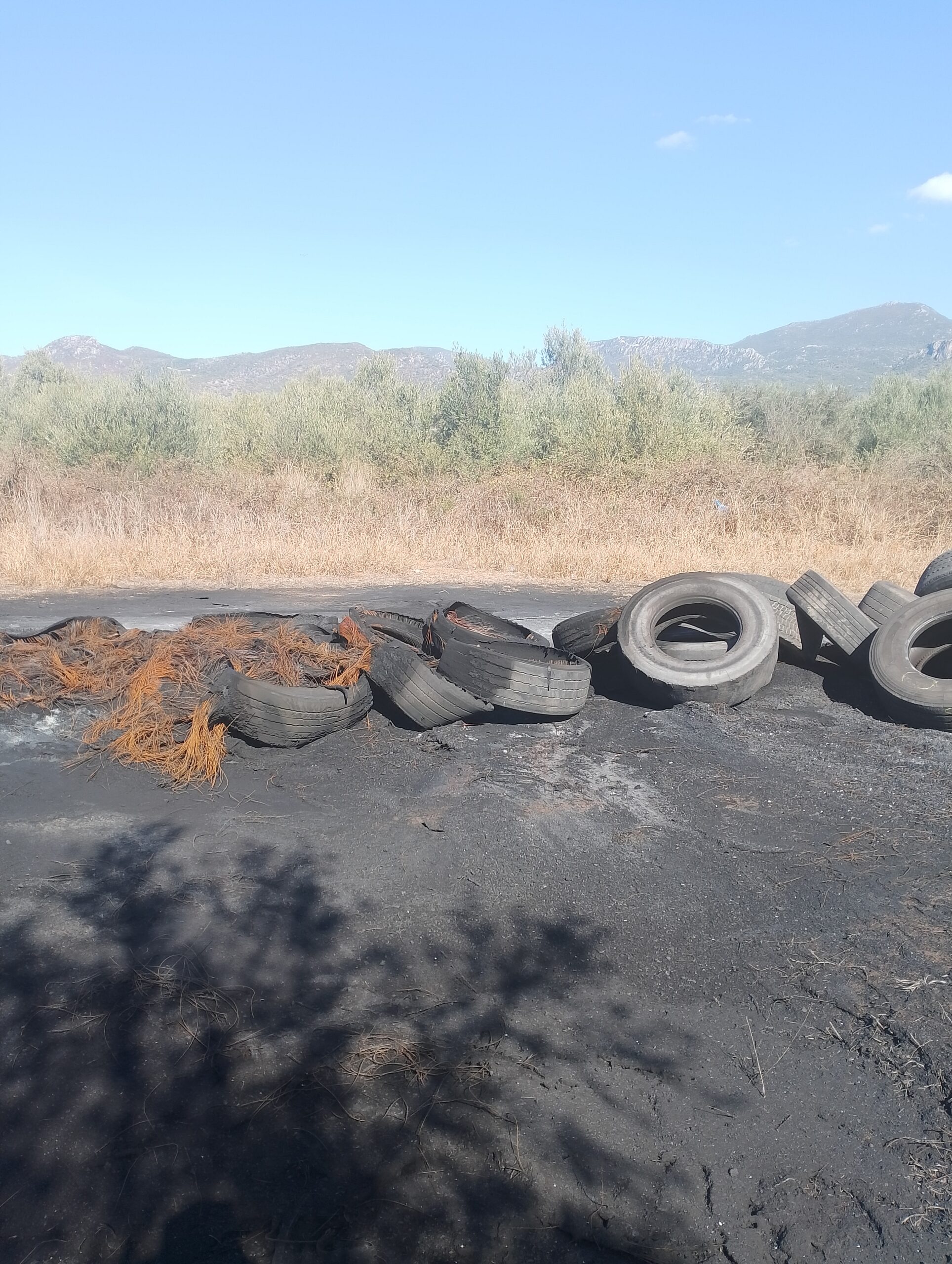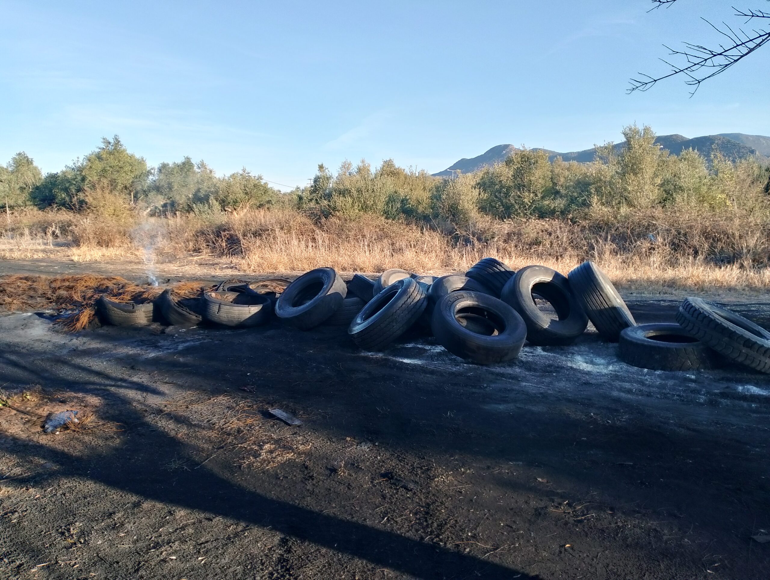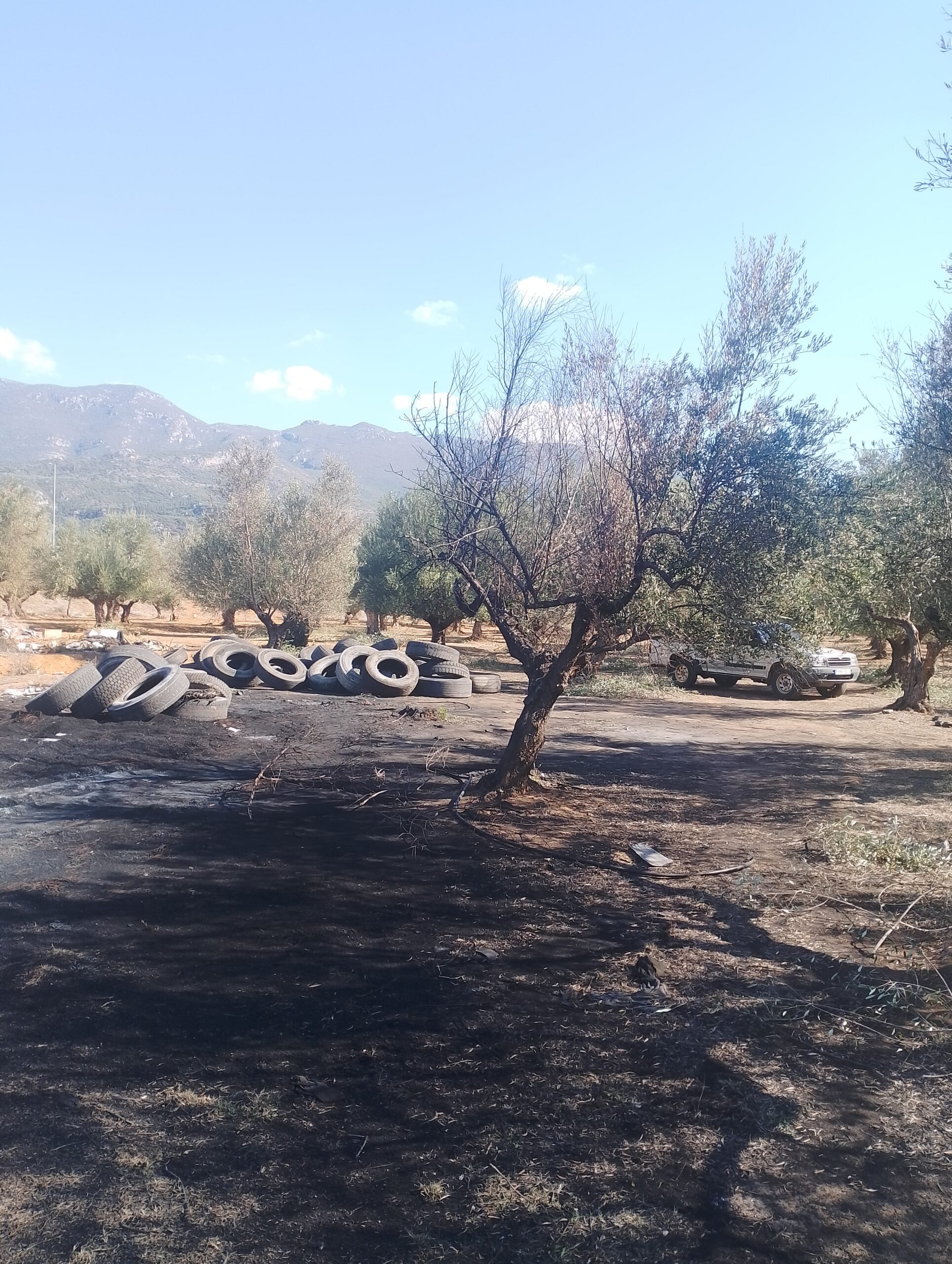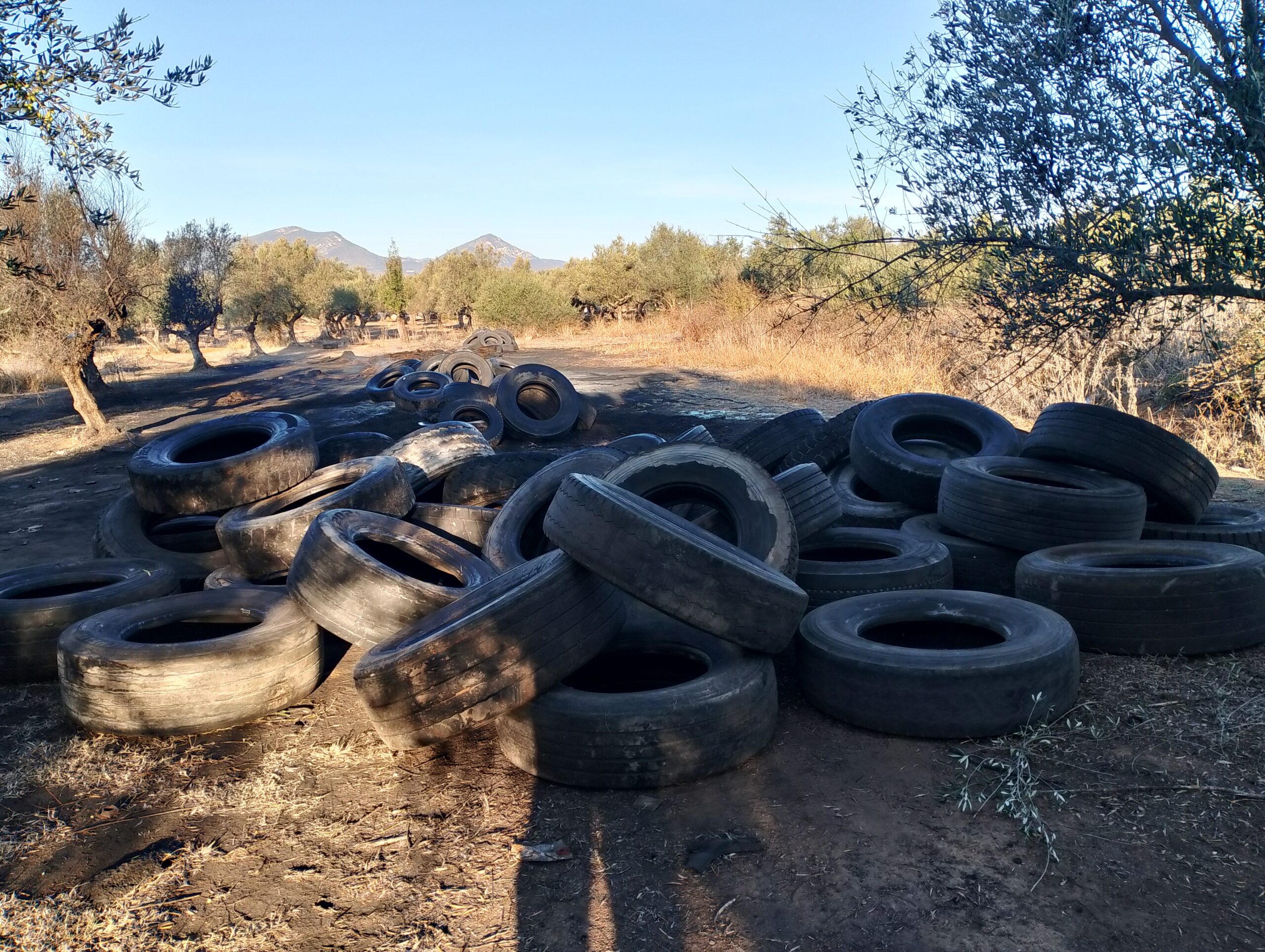 Ούτε ένας ούτε δυο αλλά τέσσερις σωροί με λάστιχα αυτοκινήτων και σε ορισμένα σημεία καμένα, με την εικόνα να θυμίζει χώρο απορριμμάτων και επ’ουδενί χωράφι με ελιές, με την μυρωδιά από τα καμένα λάστιχα ανυπόφορη.
