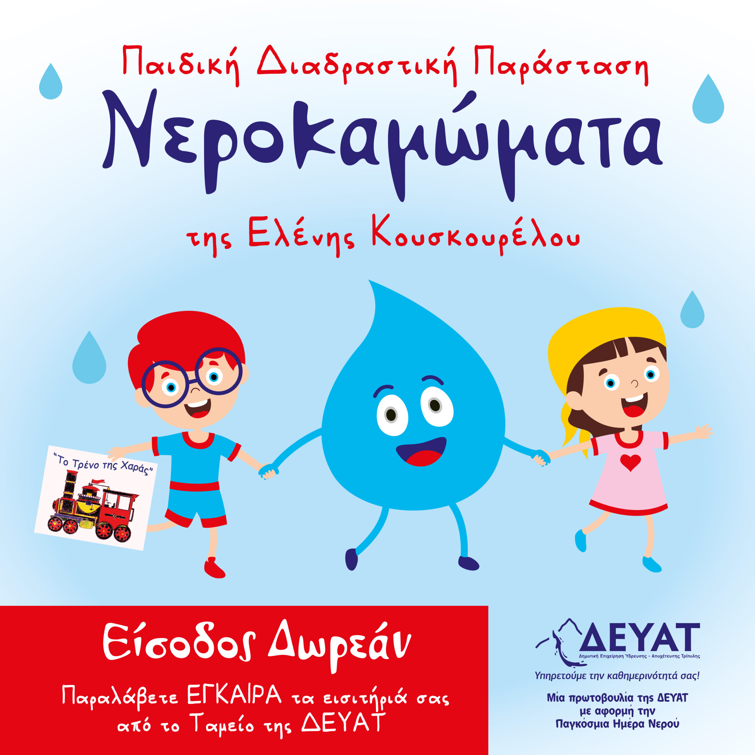 Η ΔΕΥΑΤ διοργανώνει τρεις δωρεάν παιδικές παραστάσεις, για τον εορτασμό της Παγκόσμιας Ημέρας Νερού 2025, οι οποίες θα πραγματοποιηθούν την Κυριακή 23 Μαρτίου στις 12:00 – 13:00, 16:00 – 17:00 και 18:00 – 19:00 στο Μαλλιαροπούλειο Θέατρο και είναι δωρεάν για όλα τα παιδιά του Δήμου Τρίπολης.