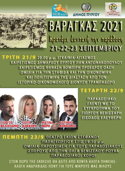 Η παράδοση, ο ρόλος των αγροτικών προϊόντων-με κυρίαρχο τη σταφίδα- στην τοπική οικονομία, τα έθιμα και η πολιτισμική κληρονομιά αλλά και ένα πλούσιο καλλιτεχνικό πρόγραμμα, «πρωταγωνιστούν» στο φετινό πανηγύρι στο Βάραγκα που διοργανώνει ο Δήμος Πύργου, η ΔΕΠ ΑΕ ΟΤΑ και ο Γραφείο Εθελοντισμού σε συνεργασία με τους προέδρους των τ.κ. και τοπικούς φορείς, από τις 21 έως και τις 23 Σσεπτεμβρίου.