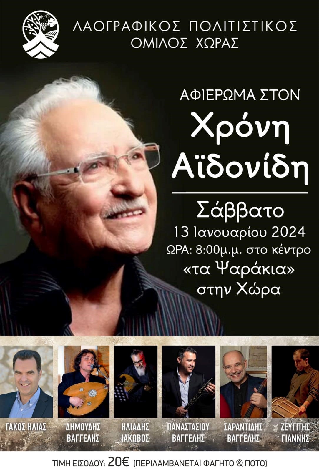 Ο Λαογραφικός Πολιτιστικός Όμιλος Χώρας διοργανώνει το Σάββατο 13/01/2024 συνεστίαση για την κοπή της Πρωτοχρονιάτικης πίτας με αφιέρωμα στον Χρόνη Α’i’δονίδη.
