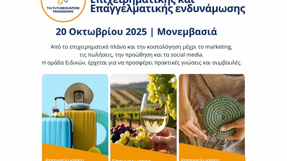 Η Wise Greece, με την υποστήριξη του TUI Care Foundation και σε συνεργασία με το Peloponnese Tourism Academy της Περιφέρειας Πελοποννήσου και τον Δήμο Μονεμβασίας, σας προσκαλεί στην Ημερίδα Επιχειρηματικής και Επαγγελματικής Ενδυνάμωσης – μια μοναδική ευκαιρία για επαγγελματίες ή επιχειρηματίες να ενισχύσουν τις γνώσεις και τις δεξιότητές τους.
