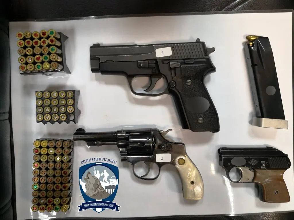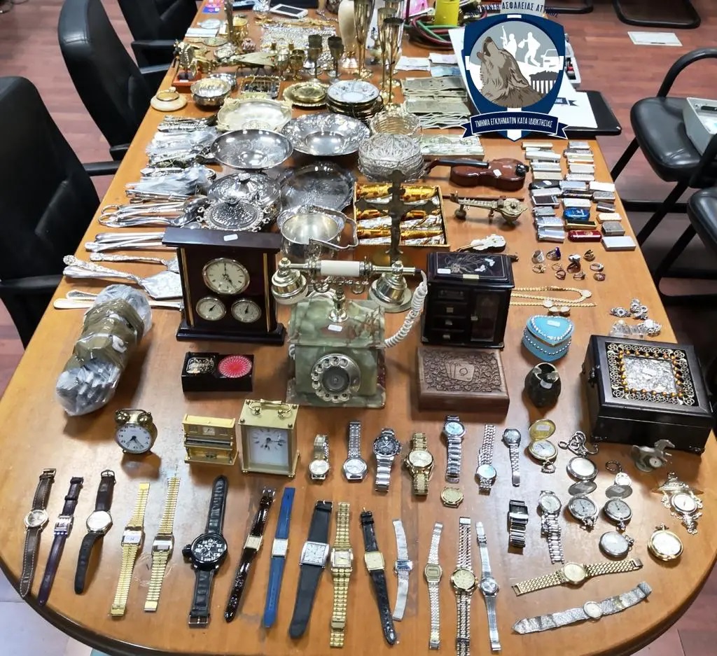 Κατασχέθηκαν πιστόλι, περίστροφο, πλήθος φυσιγγίων, πιστόλι ρίψης φωτοβολίδων, πλήθος διαρρηκτικών εργαλείων, κλειδιών, κλειδαριών και αφαλών θυρών, ηλεκτρονικές συσκευές, πίνακες ζωγραφικής, θήκες κοσμημάτων, ρολόγια χειρός και τσέπης κ.α.