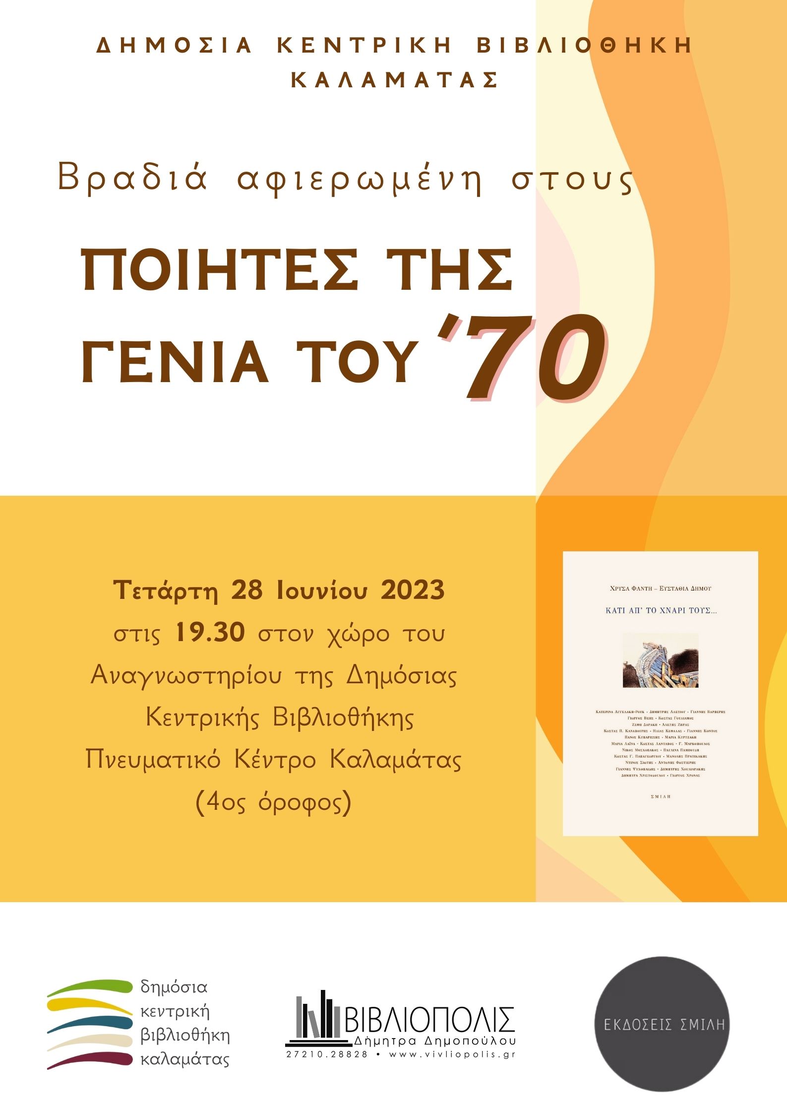 Η Δημόσια Κεντρική Βιβλιοθήκη Καλαμάτας διοργανώνει βραδιά αφιερωμένη στους Ποιητές της γενιάς του ’70, την Τετάρτη 28 Ιουνίου στις 19.30 στον χώρο του Αναγνωστηρίου της βιβλιοθήκης, στον 4ος όροφο του Πνευματικού Κέντρου Καλαμάτας.