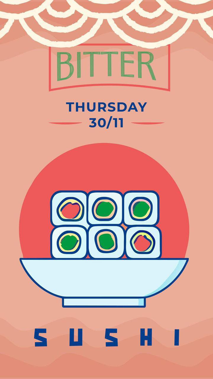 Οι πετυχημένες βραδιές φαγητού στο Bitter συνεχίζονται απόψε με συναρπαστικές γευστικές εκπλήξεις για τους λάτρεις της καλής κουζίνας. Απόψε η βραδιά έχει ύφος ιαπωνικό και στο μενού θα βρείτε μοναδικές προτάσεις sushi.